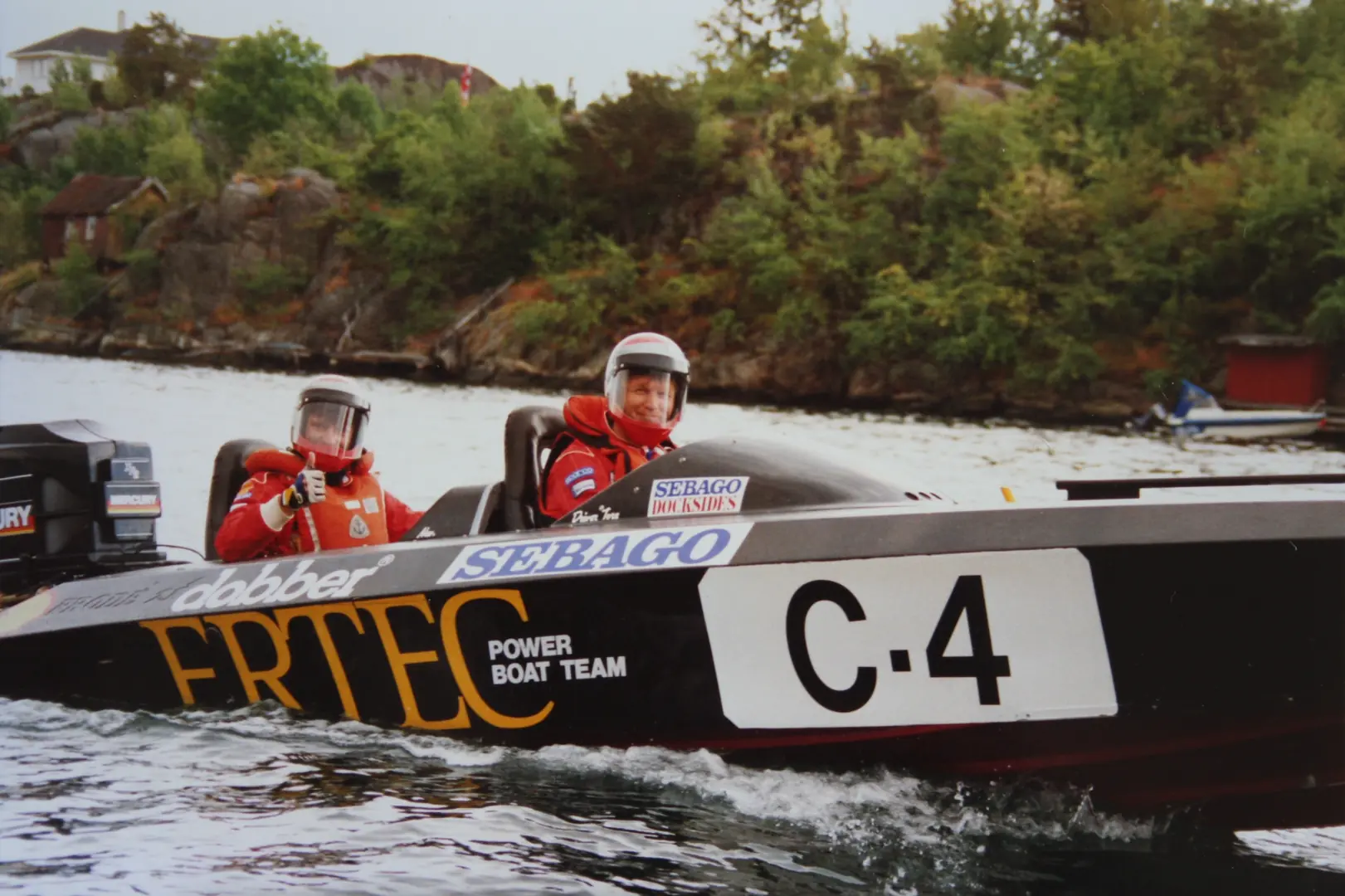 – Ja, jeg begynte å kjøre race selv i 1980 sammen med Svein Johnsen fra Porsgrunn. Han hadde en 19’ Fjordwing fra 1969, med 3 ltr BMW-motor. Båten lagde mye lyd, og gikk drøye 50 knop. Debutløpet var som navigatør i Roslagsloppet i Sverige. Et løp på ca 100 nm., fra Norrtälje til Öregrund. Ingen muligheter til å prøvekjøre løypa, og med flere kartruller stukket ned ved siden av stå-setet. Men vi vant klassen, og hadde det kjempegøy.