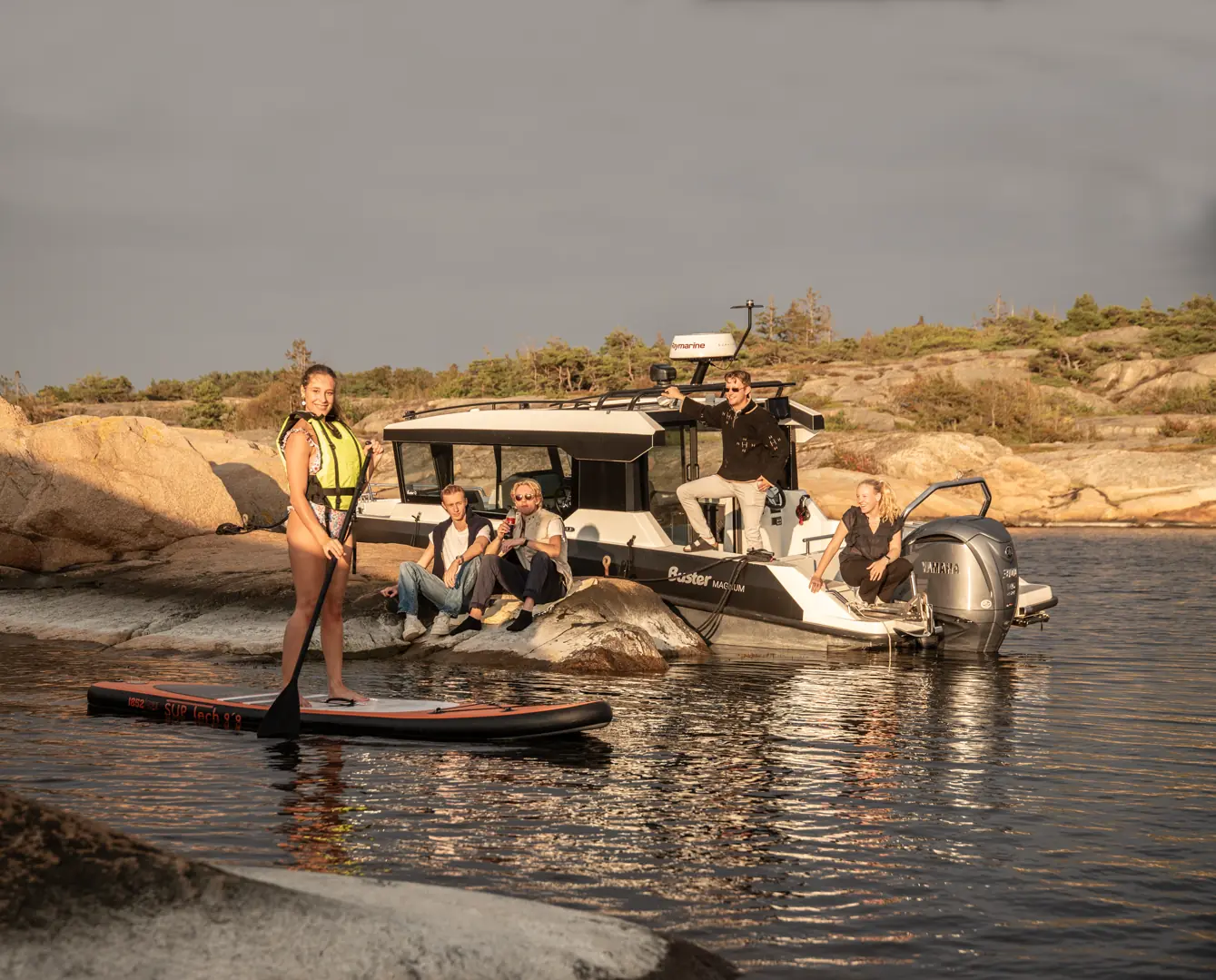 Badeplattformen har fått en moderne utforming med to nivåer, badestige lett tilgjengelig fra sjøen og to gode stuverom. På akterdekk er det også mulig å få komplett førerposisjon og klaffbenker – og vi må heller ikke glemme muligheten for å kunne laste lettere, større gjenstander på takstativet. I vårt tilfelle tok vi med et ståbrett på en av våre fotoshoots – som var lett å stroppe fast her uten å måtte slå det sammen.