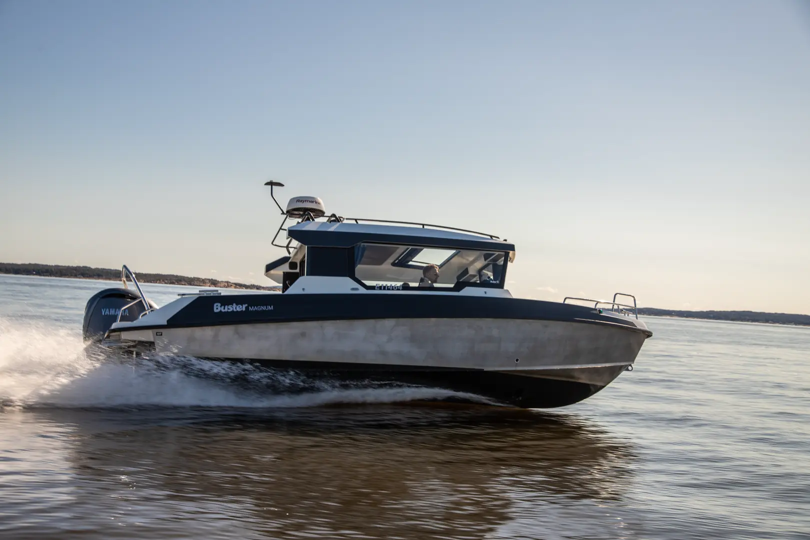 Buster Magnum Cabin har styrhus omtrent midt i båten med dør til fordekk og skyvedør til akterdekket, og med nokså smale dollbord på begge sider. Løsningen kan gi god bevegelighet gjennom båten, et styrhus i hele båtens bredde, men med noe dårligere bevegelighet langs sidene. Likevel oppleves båten som enkel å håndtere for en person, med gode muligheter for å henge ut fendere uten å måtte klatre langs dollbordene.