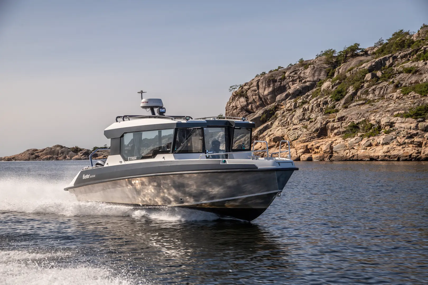 Hovedingrediensene er likevel de samme: Et skrog i aluminium og et overbygg i glassfiber med noen aluminiumsdetaljer. De to materialene er brukt om hverandre både for å gi et røft uttrykk, men nok mest av alt for å skape en praktisk allrounder. På dekk og i kabinen er for eksempel dørken dekket av mønstrede, sklisikre aluminiumsplater. I kabinen er de teppebelagte i vår testbåt, men ute er løsningen mer vedlikeholdsfri.