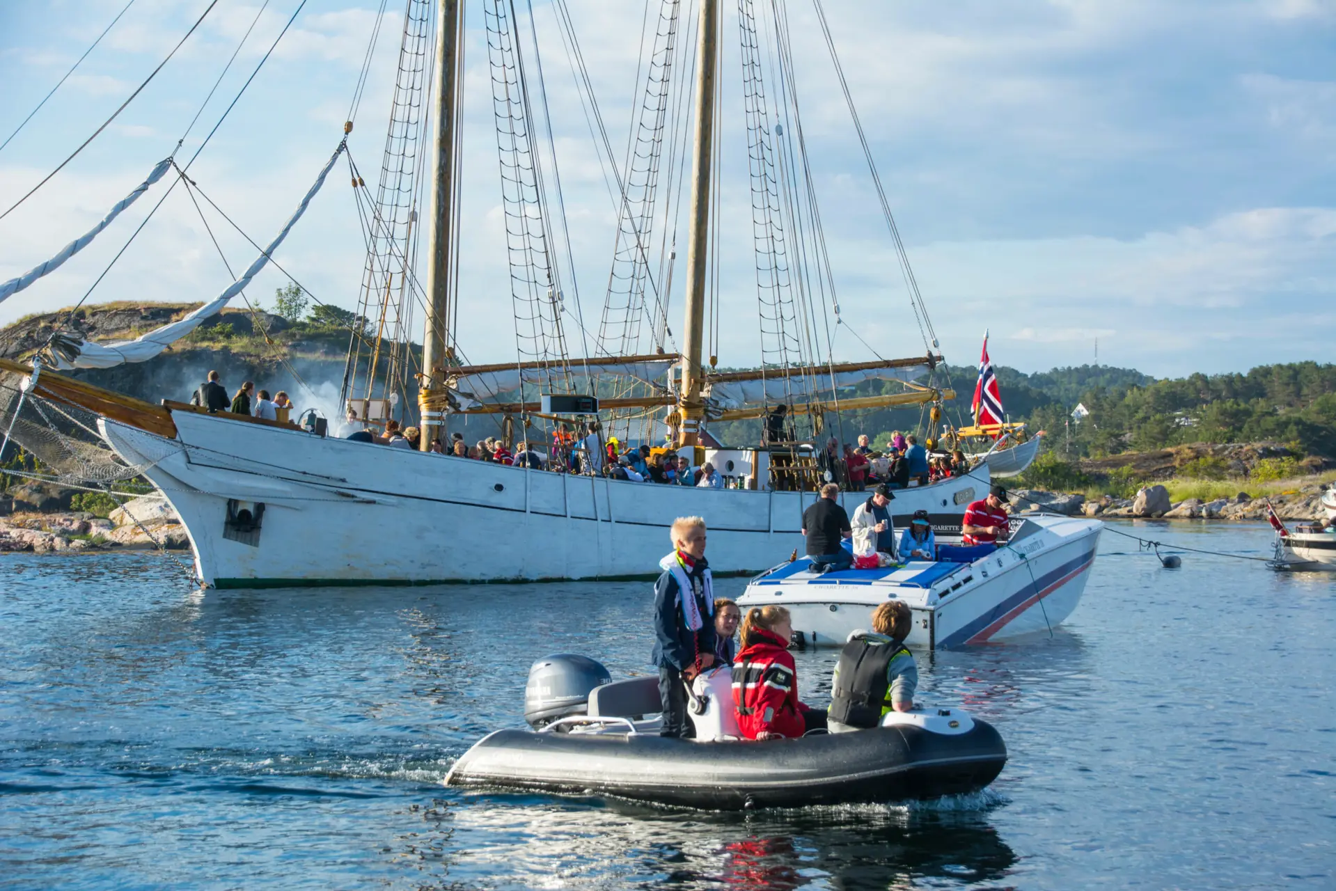 Største båt var skonnerten Solrik på 67 fot, og mellom «vanlige» båter var det innslag av pyntede trebåter, men også plastbåter som hadde fått pyntegjenstander, bjørkeris og blomster på dekk. Det er til tider trangt med så mange båter på et lite sted, men i høflighetens navn og båtfolkets ånd, er det bare en arm eller et bein som skal til for å forhindre «kollisjon» og sammenstøtninger. Stemningen her er til å ta og føle på.