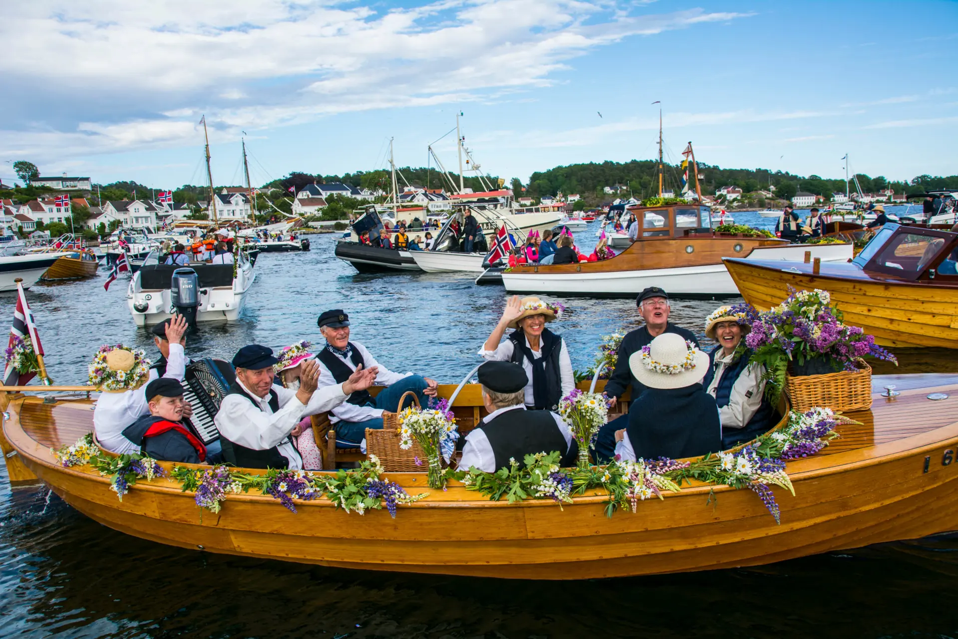 Mellom «vanlige» båter var det innslag av pyntede trebåter, men også plastbåter som hadde fått pyntegjenstander, bjørkeris og blomster på dekk.