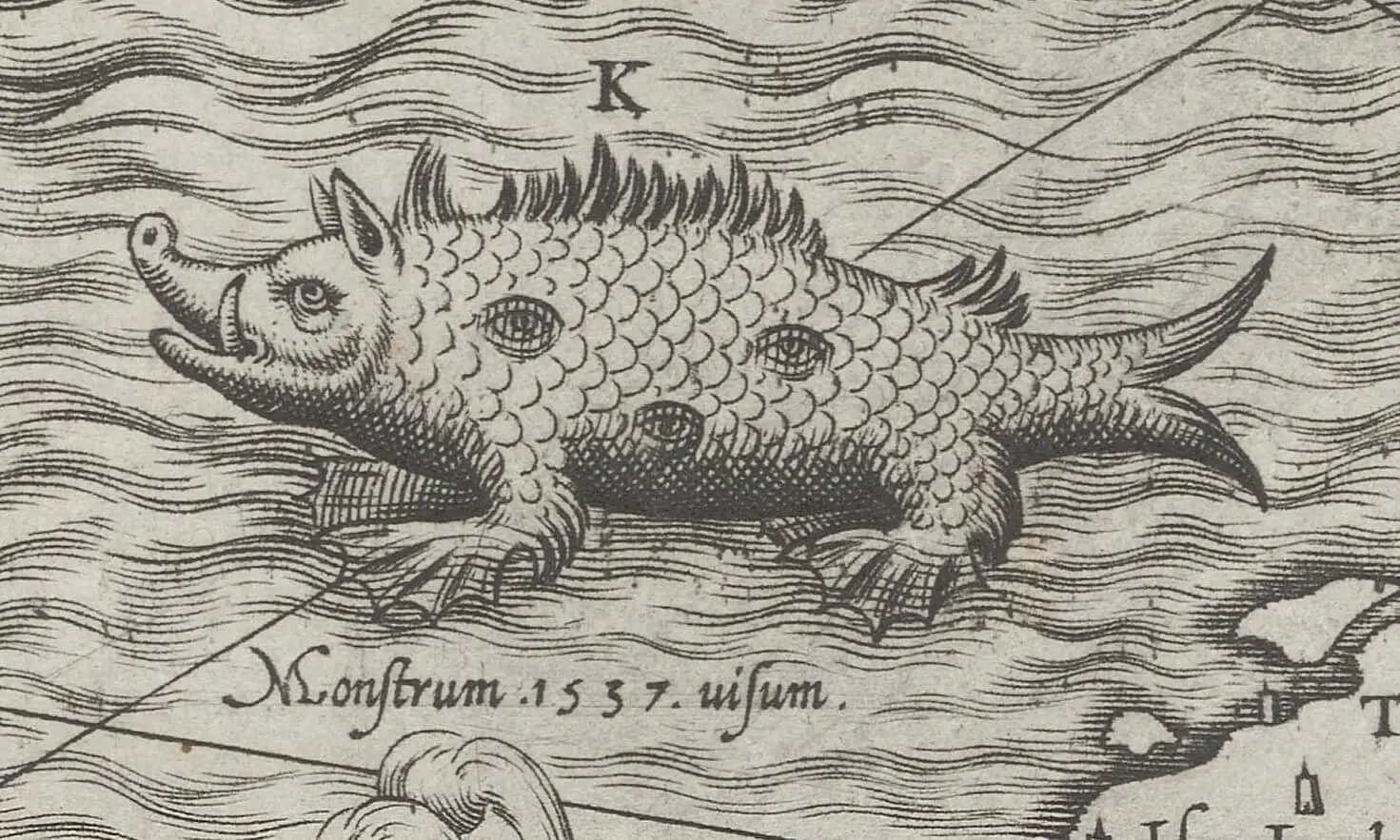 Ifølge Olaus Magnus hadde alle dyr på land sin motsats i havet. Vi leser sjøneshorn, sjøharer og om hvaler med firkantede, taggete, spisse hoder som ligner på et opprykket tre. Kroppen deres var dekket med gåslignende fjær og hodet var kullsvart og rundt seks meter langt. Øynene var kunne bli fem meter store med pupiller som lyste illrødt. Når det var mørkt kunne fiskerne se de flammende, røde øynene stirre på dem fra dybt nede i havet. Da var det fare på ferde!