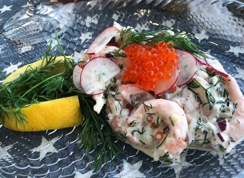 Finhakk løk og bland reker, løk, dill, majones og rømme. Riv skall av halvparten av sitronen og del den i to. Ha det revne skallet i rekeblandingen og smak til med sitronsaft, salt og pepper. Del resten av sitronen i båter.