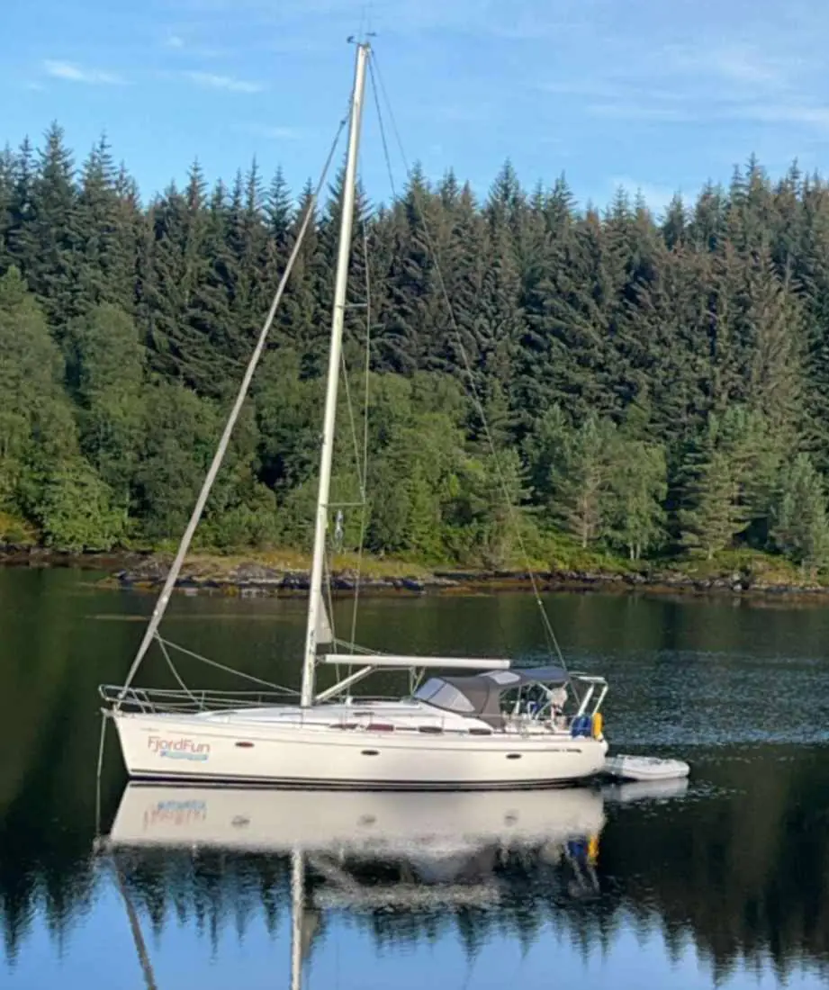 – Vi seilte videre til Dinja, som også er et idyllisk sted, med strand, flotte turmuligheter og en liten landhandel. Dinja ligger ved Sognefjorden, og er fin for oss som skal videre nordover. Her er flytebrygger å legge til ved. Her møtte vi også et motorbåtpar, som ønsket å prøve seilbåt, men var helt ferske på sjøen. De hadde aldri vært ombord i en seilbåt før.