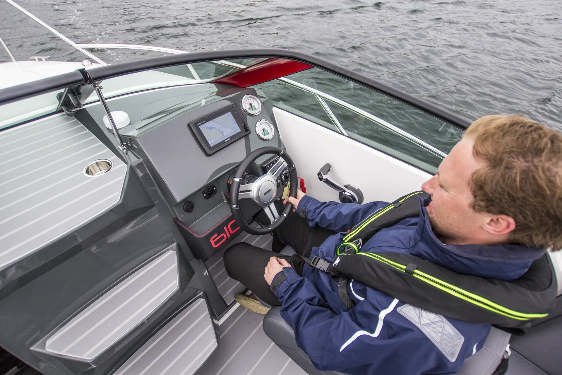 Skroget er det samme for alle modellene, men kjøreegenskapene er noe ulike avhengig av vektbalansen i båten. Vi har kun kjørt DC- og S-utgaven (konsoll), og vektdifferanse på ca. 70 kilo merkes med noe mer sportslige kjøreegenskaper for konsollbåten. Ganske naturlig når båten får en annen vektbalanse og du sitter i senter av båten og kjører. Selv om vi ikke fikk brynt oss på de mest utfordrende forholdene utenfor Tønsberg-øyene denne dagen, registrerer vi at skroget er mykt i sjøen, har en lav planingsterskel og har god sportslighet i forhold sin bredde. Her har du en enkel båt å kjøre, som krever minimal bruk av tilt og trim for å gå pent i sjøen med motorstørrelse fra 115 hk. til 150 hk. Med største motoralternativ gjør båten 33 – 35 knop på topp, og en fin marsjfart ble målt til rundt 25 knop med to personer om bord.