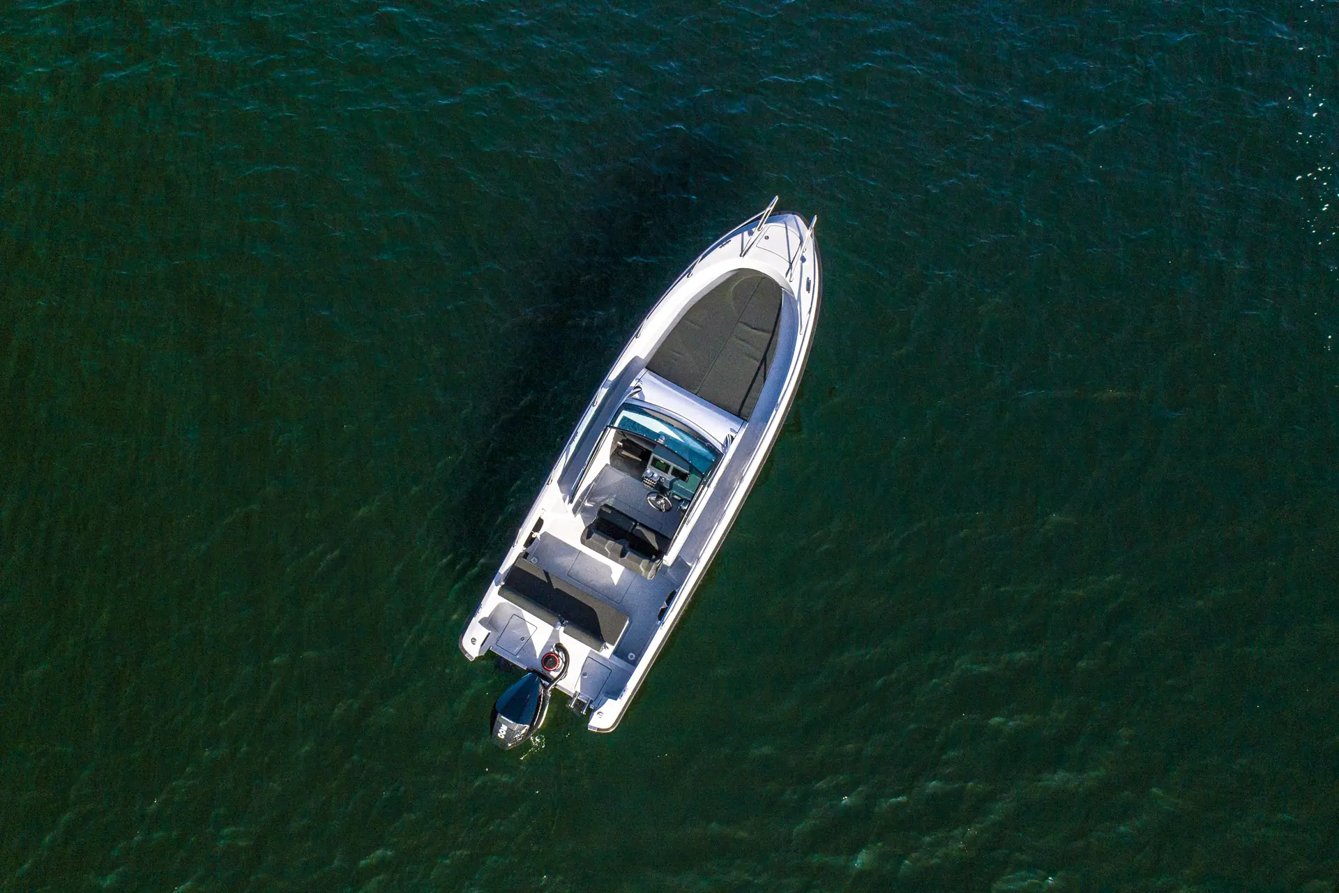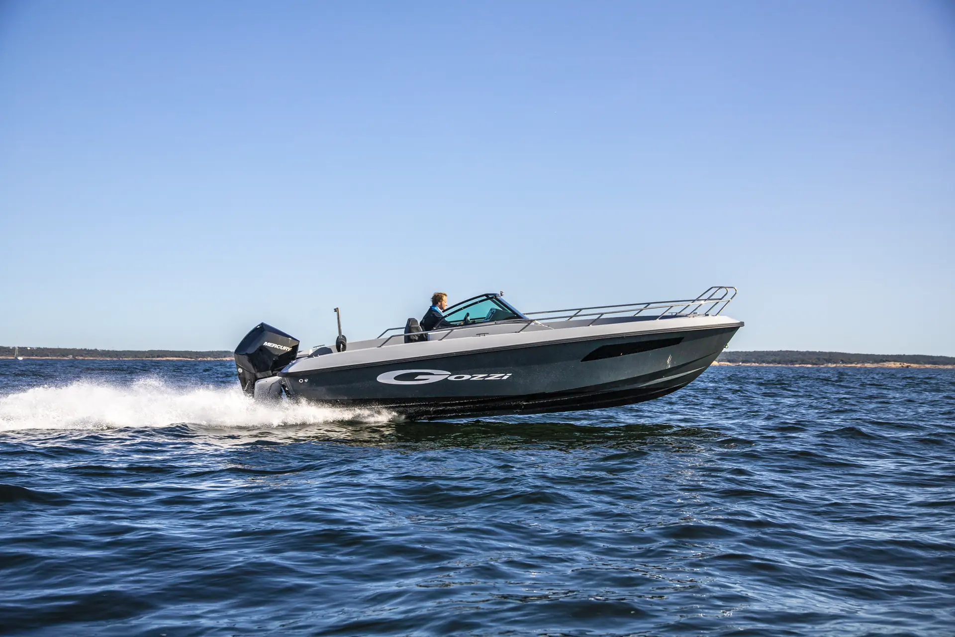 Planingsterskelen er minimal, og vi får følelsen av å kjøre en større båt enn det den totale lengden på 7,25 meter skulle tilsi. Gozzi leveres med Mercury, og på vår testbåt sitter en Verado V8 300 hk., men båten er godkjent for 400 hk.