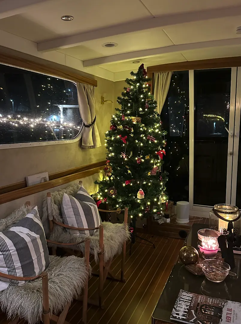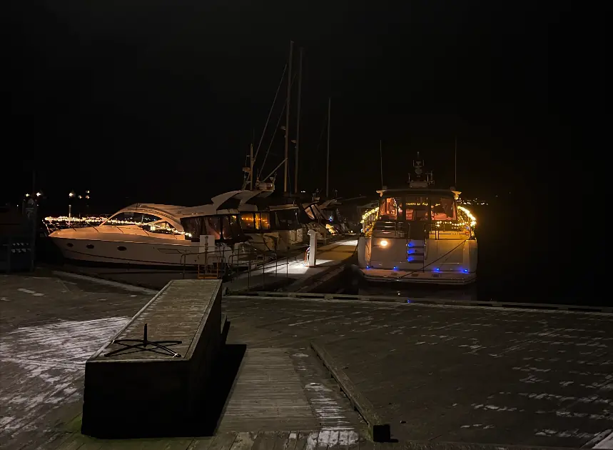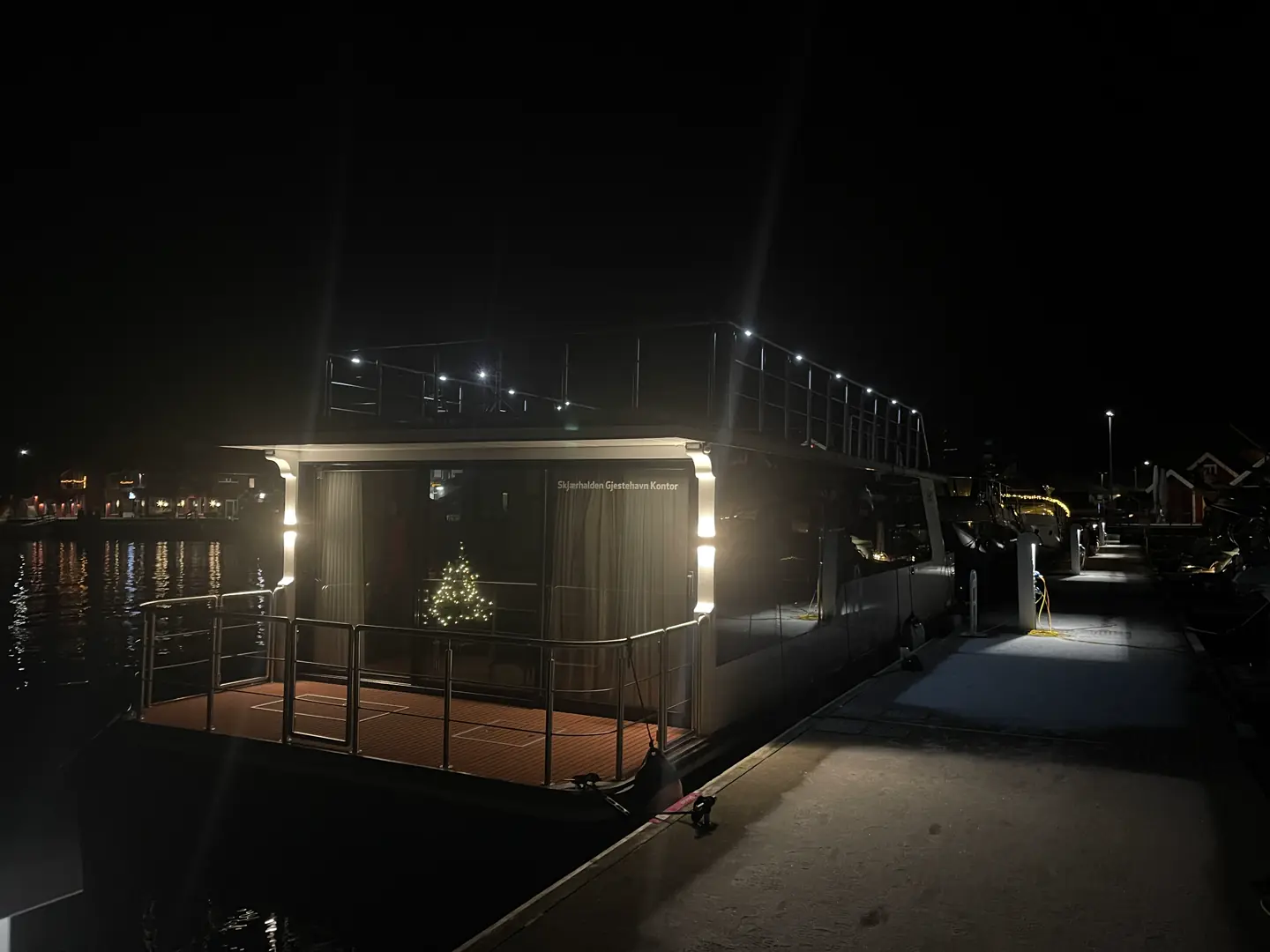 Og så er det stemningen. Den er ikke mulig å forklare uten å oppleve den. For når desember kommer, skjer det noe på Skjærhalden. Både båtene og havna blir julepyntet – noen med full julebelysning og juletre om bord, andre med mer diskrete, varme lys som glitrer i vintervinden. Havna lyser opp som et lite julekort, og sjøen speiler alt sammen som en stille, mørk bakgrunn.