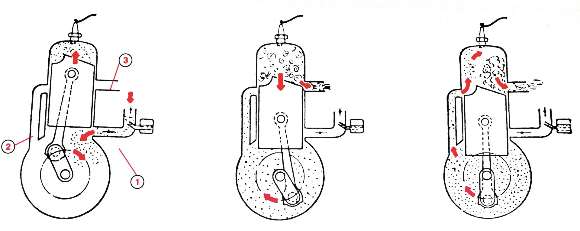 Selve innsugsporten står i direkte forbindelse med veivhuset gjennom en kanal i motorblokken. Åpningen befinner seg lavt nede i sylinderen. På motsatt side av sylinderveggen er eksosporten. Den står litt høyere. Stempelet åpner derfor denne litt før innløpsporten på sin vei nedover.