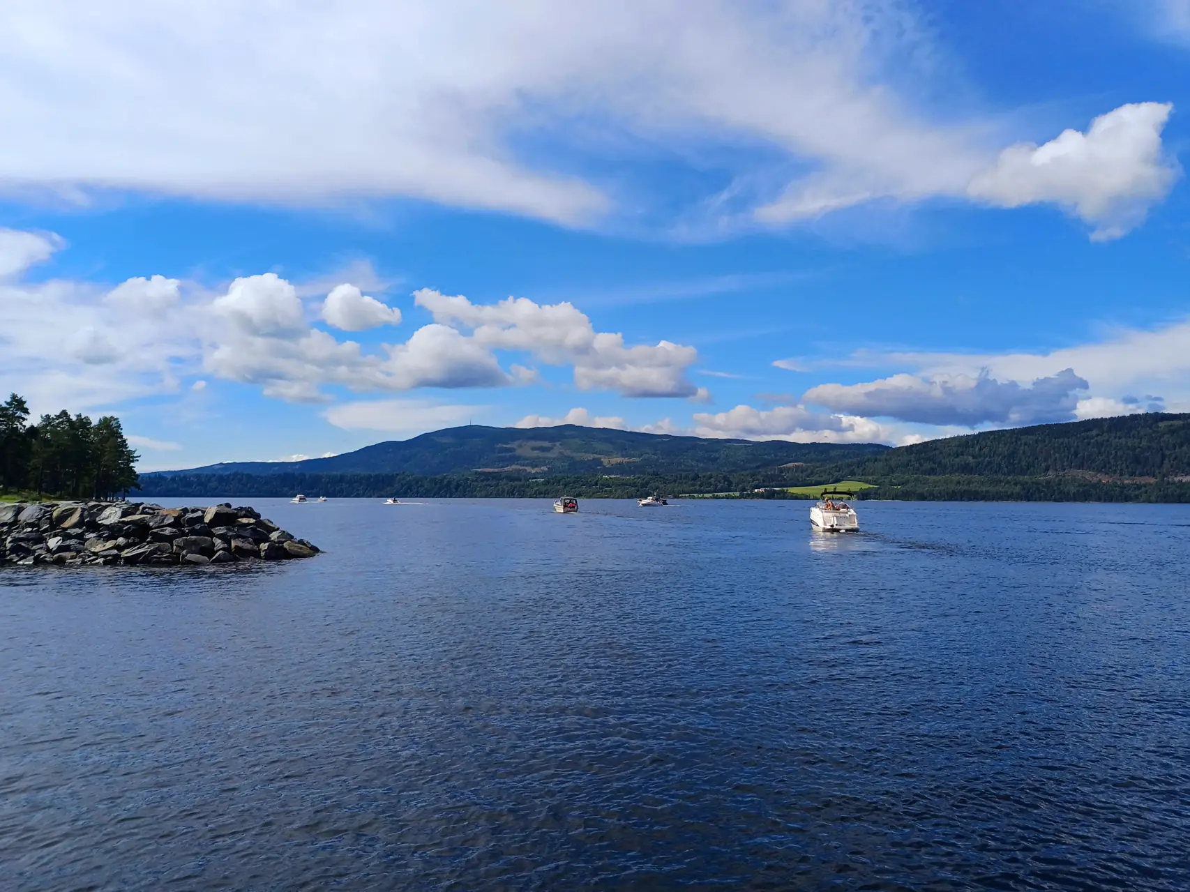 Vi dro fredag 19. juli fra Ørbekk Båthavn som er den sørligste båthavnen i Mjøsa, i strålende sommervær.