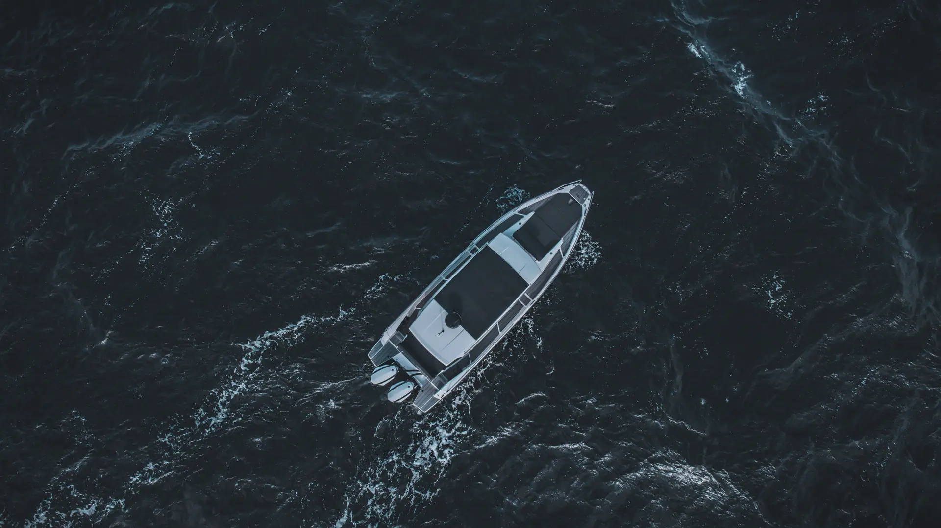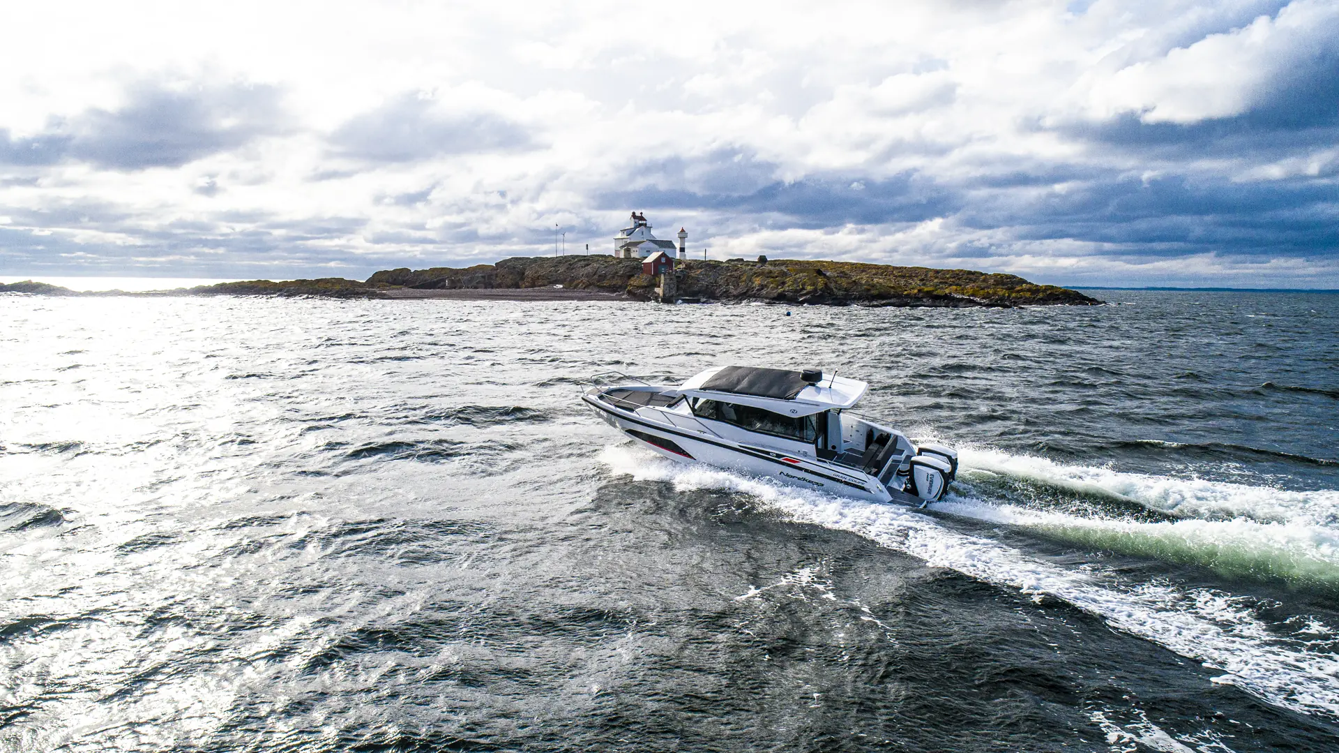 At skroget er lettdrevet, er det liten tvil om. Akselerasjonen med to stykker totaktsmotorer fra Evinrude på hekken er også imponerende. Båten på like over tre tonn har toppfart på 41,5 knop med en 300-hester, og 50 knop med 2 x 200 hk., som er største motoralternativ. Det er lagt inn støydempingsmatter i skroget for å dempe klukke- og sjølyden, og vi blir faktisk positivt overrasket over hvor lite vi hører ut ifra hva vi er vant med på mindre styrhusbåter. Det kreves ikke mye trim for at båten skal gå pent i sjøen, planingsterskelen er minimal, og vi blir også overrasket over hvor lite trimflaps som kreves med den berømte sidevinden.