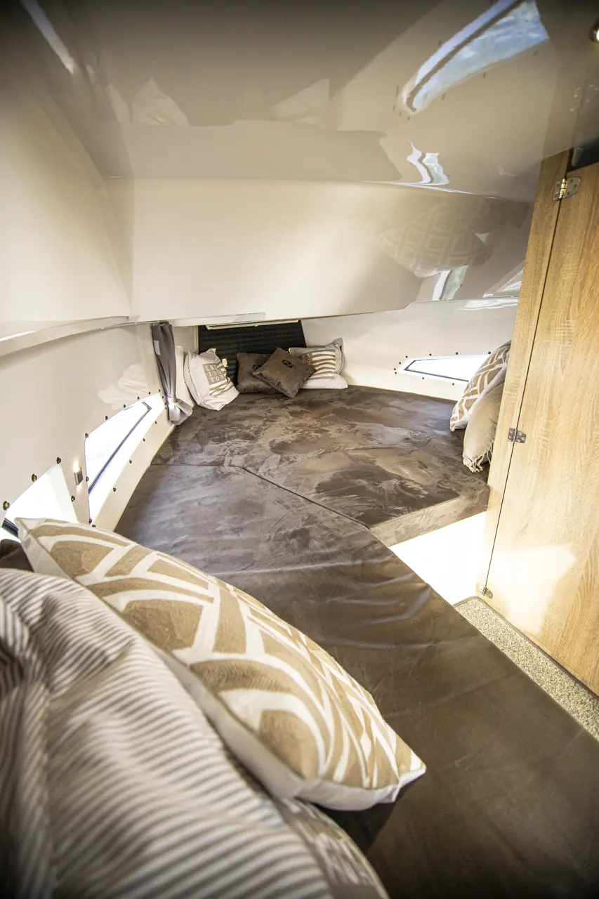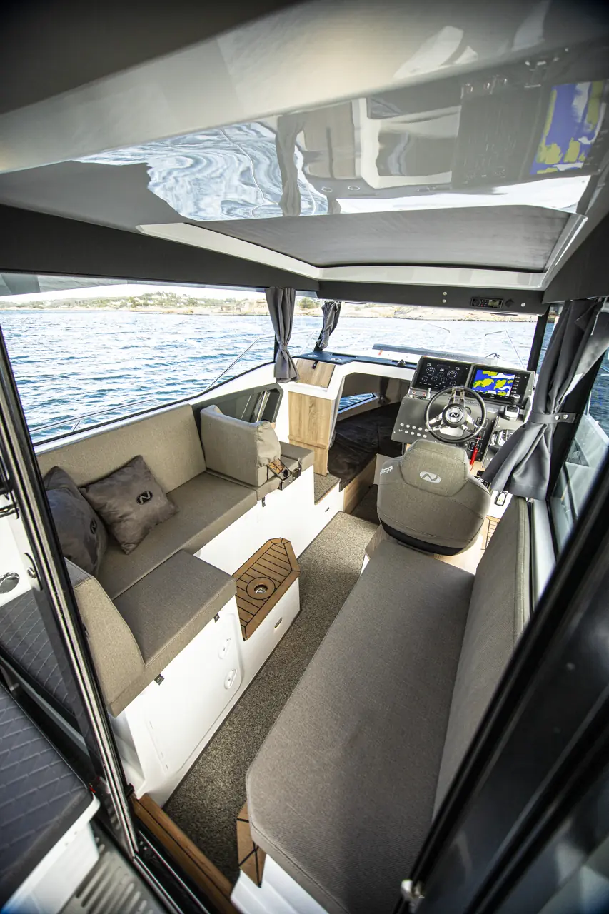 I det midstilte styrhuset er det etter vår mening førermiljøet og materialvalget som stikker seg mest ut. Takluken kommer i to varianter – enten en «soft-top» løsning der nærmest hele taket åpnes elektrisk - som på vår testbåt, eller med to luker. I salongen er det sitteplasser til fem personer, i tillegg til at førersetet kan vendes. Salongbordet har funnet sin naturlige oppbevaringsplass i eget stuverom under sofaen, og med noen mellomleggsplater får en-to personer overnattingsplass her.