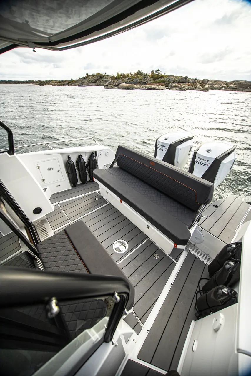 Akterdekket er innredet med to sittebenker som enkelt kan fjernes med et par skruer, samt et stort bord. Under benkene er det rikelig med stuveplass, og med en mellomleggsplate får du solseng. På hver side finnes fenderholdere for til sammen seks fendere. Også badeplattformen har to stuverom for tauverk og slikt, og både ankeret og badestige ligger under plattformene.