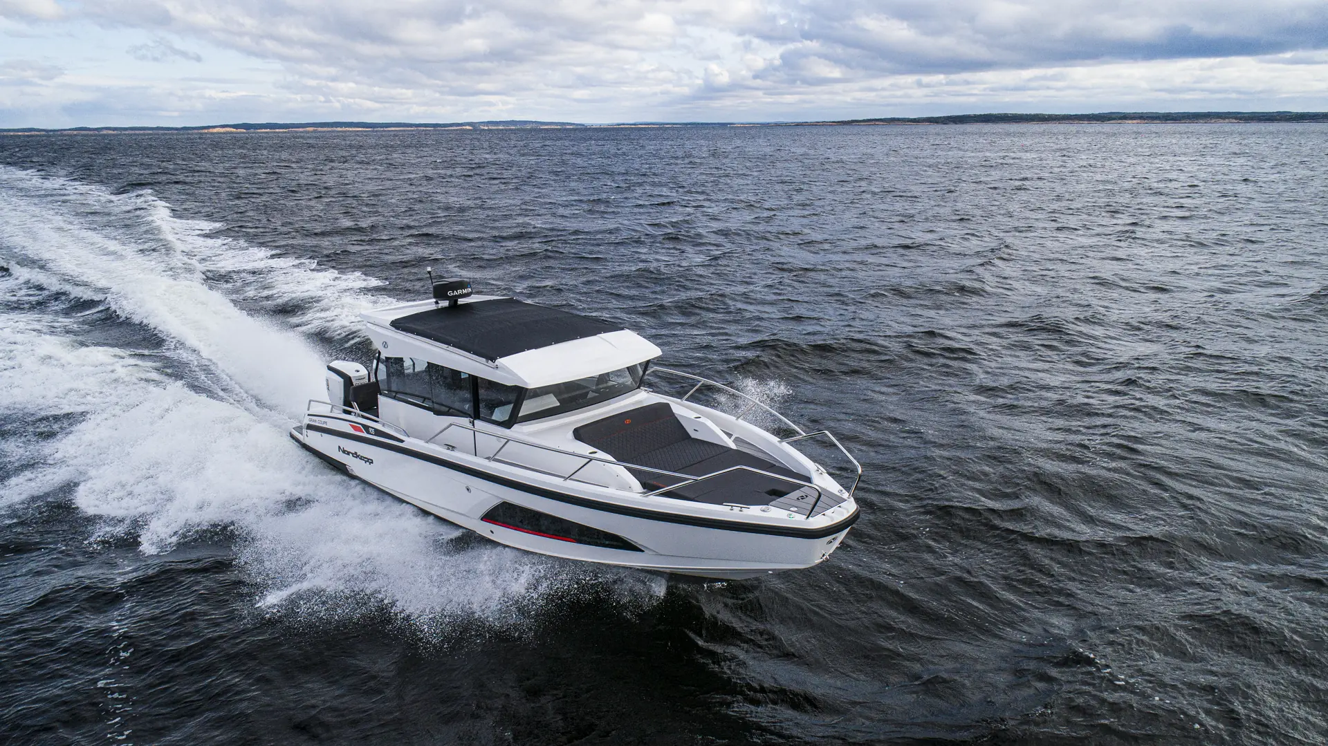 – Vi prøver å fri til de som skal bruke båten på dagsturer, til transport, fiske og med overnattingsmuligheter til fire-fem personer, forteller Thorup. Et viktig element her, er at båten skal være enkel å håndtere for en person. Eksempler på det er midtstilt styrhus med like brede, nedfelte dollbord på hver side, enkel adkomst til badeplattform rundt motoren(e) og bred skyvedør på styrbord ved førerposisjonen. Kalesjen følger hytta akterover med samme bredde og er dermed heller ikke i veien når den er slått opp. Smart!