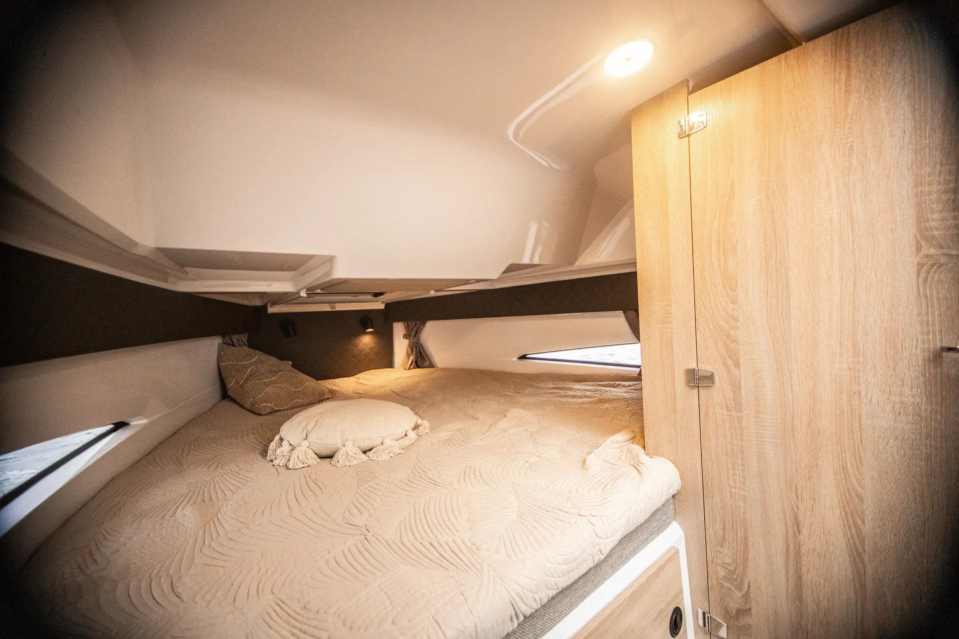 Om bord i vår testbåt finnes et standard kjøresete med sitte- og ståstilling, men om vi skulle benyttet båten til langturer ville vi vurdert en oppgradering til et sete med demping. Utover det er førermiljøet upåklagelig med mulighet for to Garmin-plottere på hver 12 tommer i riktig synsvinkel, ergonomisk plassert gir/gass og justerbart ratt. Sammen med strømbrytere i ryddig oppsett, rødt nattlys og dempede farger på selve dashbordet må vi kunne si at dette er blitt en påkostet førerposisjon, spesielt i denne klassen å være. Et pluss er også at den har to separate stoler i fartsretning, og ved co-førerposisjonen er det trådløs ladning for mobil.
