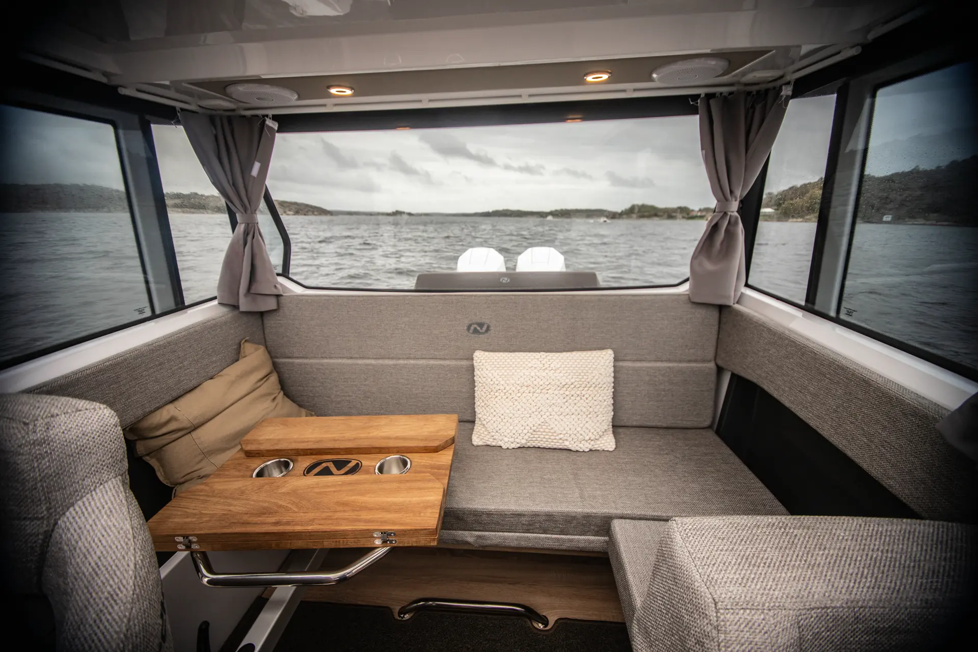 Mens 905 har bakdør mot akterdekket, er 830 mer lukket med U-sofa innvendig i styrhuset, samt to brede skyvedører ved fører- og co-førerposisjonen. Fordelen er nettopp at du får en intim U-sofa med plass til fem personer, som med tilhørende bord kan bli spiseplass for to-fire personer.