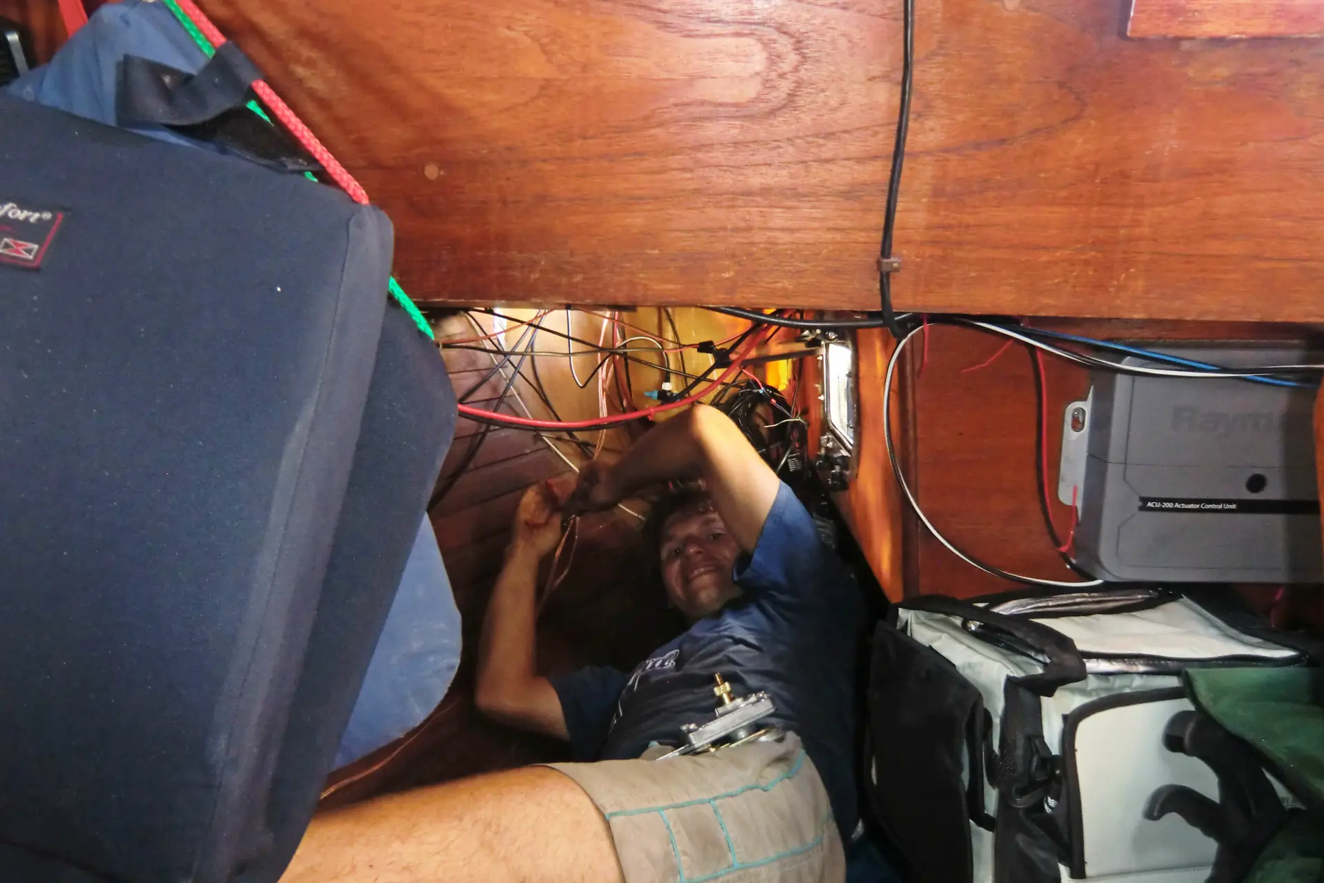 De største prosjektene ombord var unnagjort, likevel var det mye å henge fingrene i. Regnfangeren vi monterte på Grenada i somres hadde bokstavelig talt blitt spist opp av vind og vær, eller slukt av regnvannet. Til tross for filtrering hadde massevis av partikler fra den ikke fullt så solide presenningen dermed blandet seg med grums fra regnet og samlet seg i vanntankene, og man kan trygt si at det ikke akkurat var Imsdal-smak på drikkevannet! Tankene trengte derfor en grundig rengjøring, og en ny, robust regnfanger var allerede på plass. Strømmangel har fulgt oss store deler av reisen, og et tredje solcellepanel samt større batterier skulle forhåpentligvis sette en stopper for nettopp det. Batteriene var Paul selv med på å demontere fra en større charterbåt, og hadde sakte, men sikkert fått teken på den båtelektriske biten. Etter mye om og men fant vi rom til de tre blytunge klossene, før arbeidet med å legge nye ledninger kryss og tvers kunne begynne. Da puslespillet endelig var på plass var både mannskap og regulator fornøyd, så vi får bare håpe det varer.