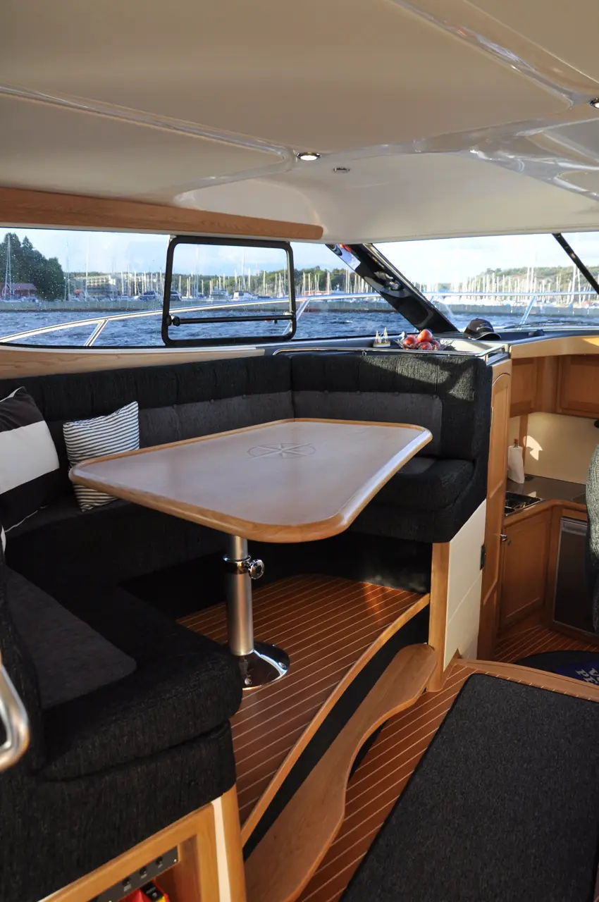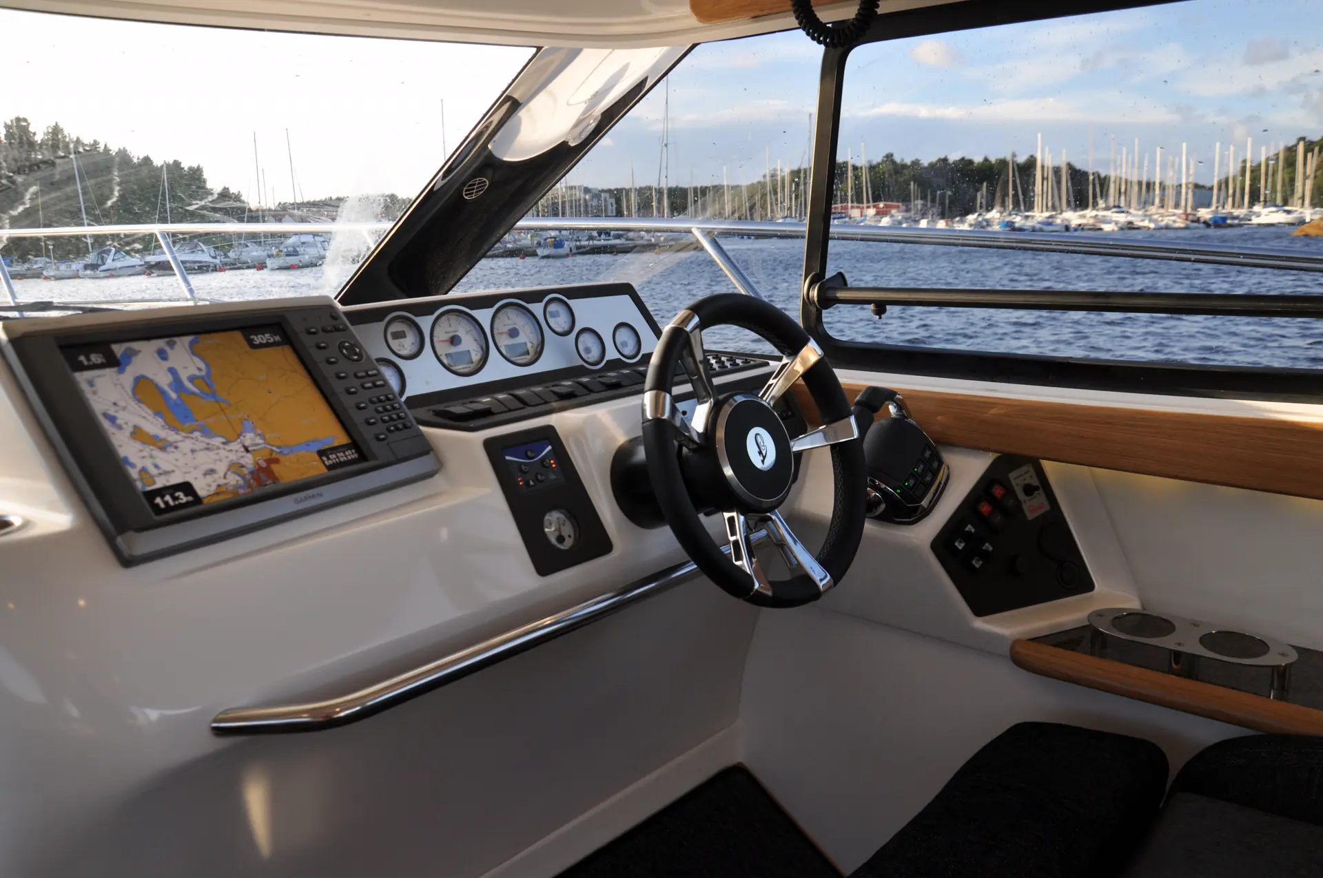 På turen fra Son til Strømstad opplevde vi en del rufsete sjø, og fikk testet båten både under rolige og mer rufsete forhold. Fra førerplassen har vi god oversikt takket være store vinduer, og instumentene er hensiktsmessig plassert, med kartplotter til venstre, gir og gass tilgjengelig på høyre hånd, og instrumenter over rattet. Med to Volvo Penta D4-300 går naturligvis båten raskt i plan – som største motoralternativ, og vi erfarer raskt hva båten er god for. Omsider måler vi 36 knop med 3 500 omdreininger, en fart som selvfølgelig ikke står i stil med krapp sjø. Ved å slakke av til marsfart på rundt 20 knop og turtall på 2 500, går skroget mykt og stabilt i sjøen, men da slår naturligvis båten en del i krapp motsjø, og vi opplever noe sprut. Båten føles trygg i både med- og sidesjø, og vi kan enkelt føre en behagelig samtale om bord under marsfart.