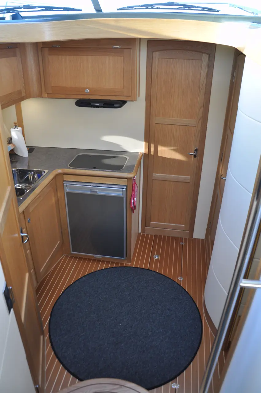 Selve planløsningen for salongen er rimelig standard det vi kan finne om bord i båter i denne klassen. På styrbord side finner vi dermed en bysseseksjon som strekker seg frem til førersetet. Selv om ikke dette er «hovedbyssa», er den utstyrt med både komfyr, vask og mye skap- og benkeplass, og mange vil nok foretrekke å lage mat hvor det er utsikt, enn å gå ned under dekk, hvor Forbina har valgt å droppe sofa, men heller gi plass til en L-formet kjøkkenkrok og et stort toalettrom. Byssa er rikelig utrustet med kjøleskap, to vaskekummer, bluss med god vifteløsning og mye skapplass. Dette er en av de største vi har sett i denne klassen, og høyden og den gode skap- og skuffeplassen gjør at det er enkelt å bo godt om bord.