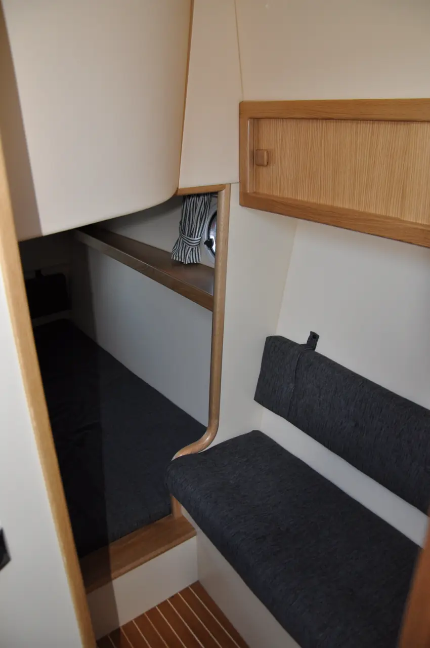 Imponerende nok har Forbina klart å få syv faste sengplasser i sin nye 42-foter fordelt på tre kabiner, og frir med dette til større familier – der to barn kan få hver sin kabin, mens mor og far får privatliv i egen lugar foran eller midtskips. I forpiggen er det nemlig plass til tre personer, og i de to kabinene akterover finnes dobbeltseng. Vi opplever kabinene som romslige, med mye nturlig lys gjennom koøyer i skutesiden og lufteluker i taket, samt elegante spotter i taket. Alle køyene har eget leselys, og det er nok stuveplass i kabinene for en lang ferie med mye bagasje.
