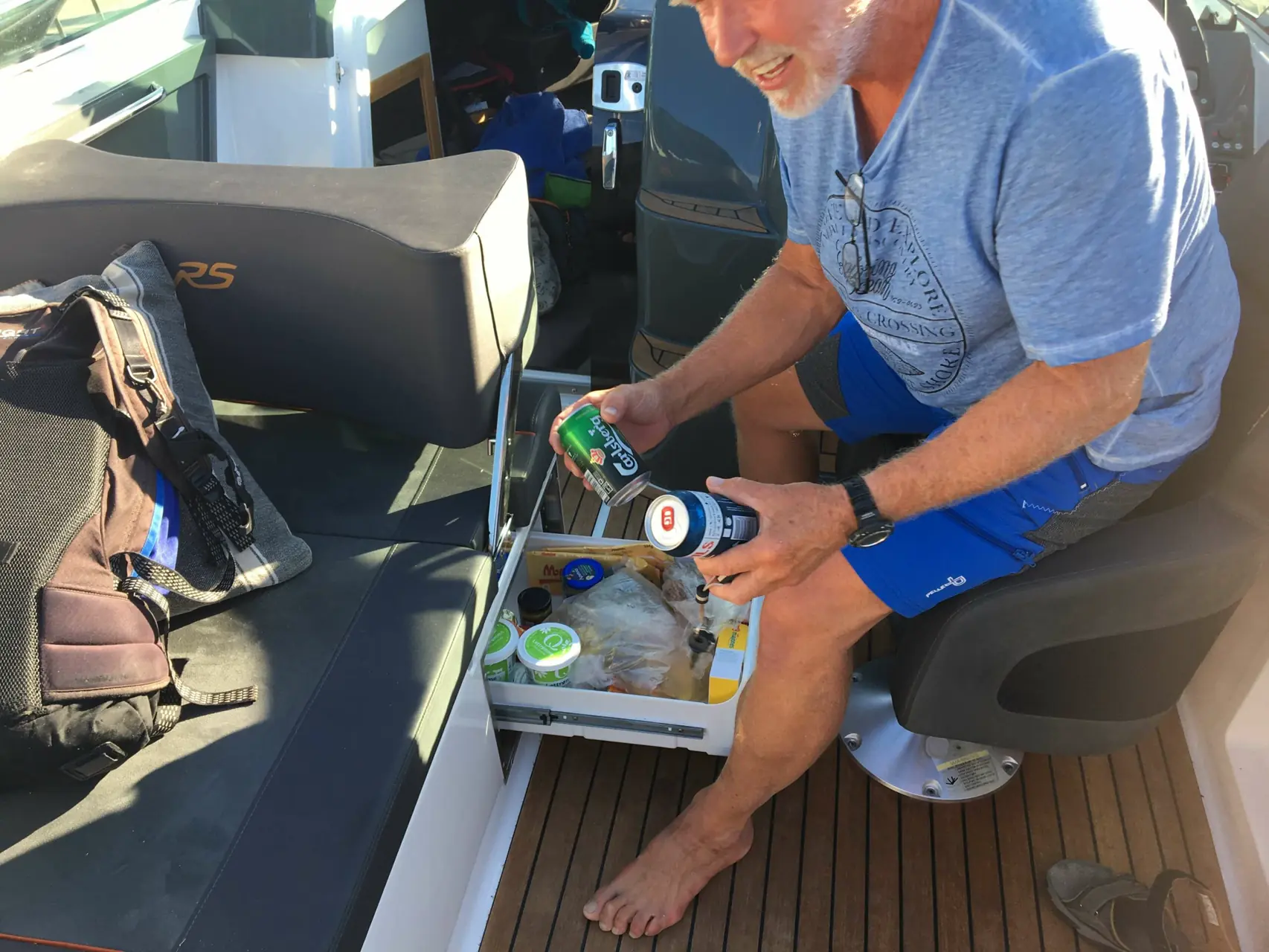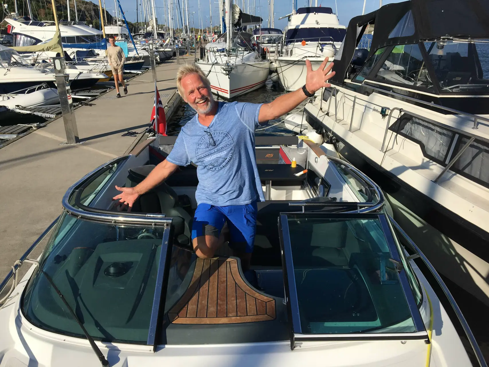 Det blir latter og smil da jeg på vegne av Båtens Verden foreslår «Reka». Og slik er det blitt. Ser dere gladgutten med sin Astrid om bord i en Nordkapp, er det nok REKA.
