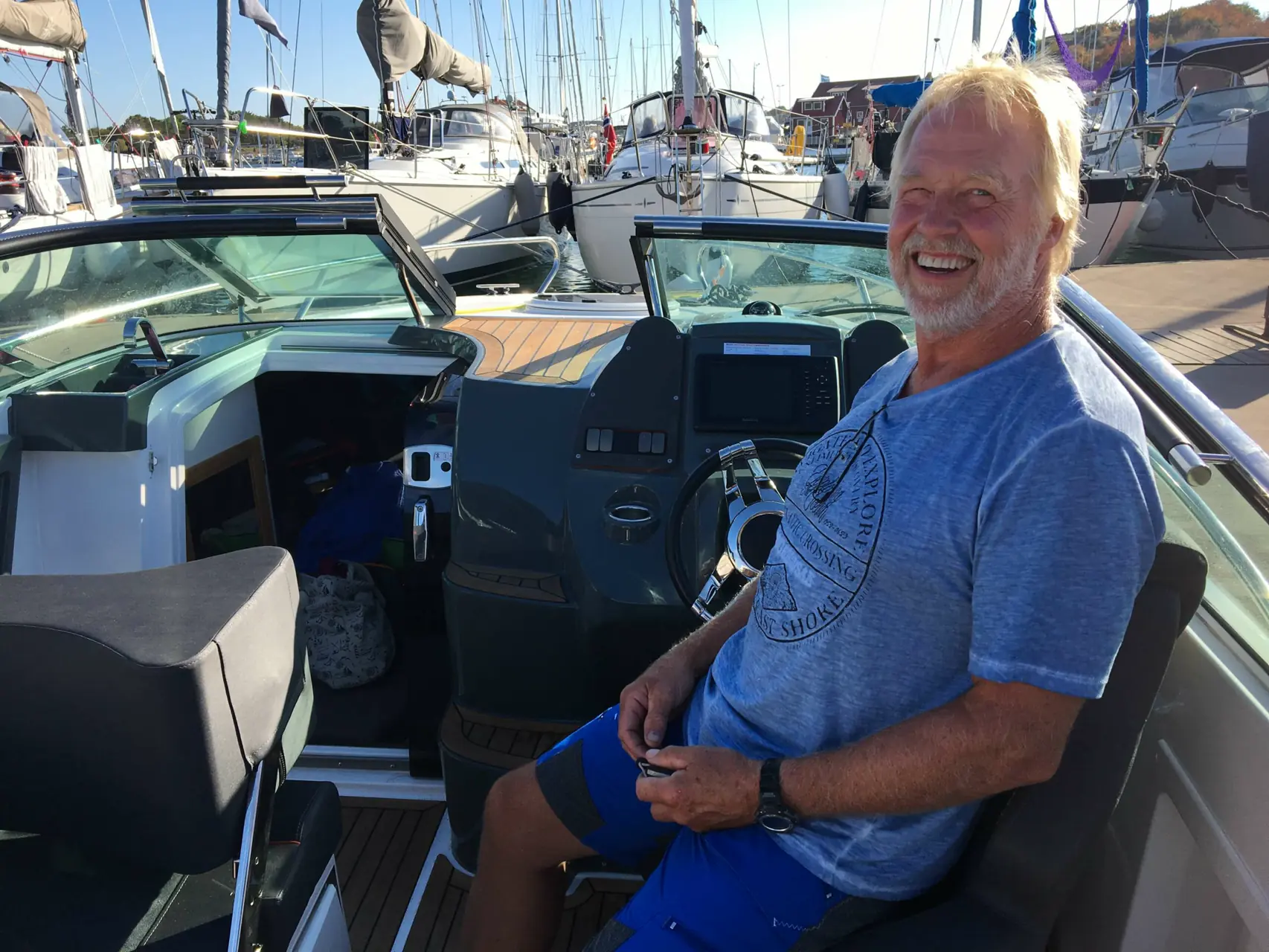 – Det fine er at Astrid koser seg like mye som meg. Vi kommer raskt frem til bestemmelses-stedet, men turen underveis er ikke så behagelig lenger. Vi nyter ikke turen på samme måte, men fordelene er mange. Båtlivet er forandret. Etappene er mer urolige, og vi er avhengig av godvær og bølgehøyde nå. Men nå er vi fremme på en time. Ikke en dag, som tidligere.