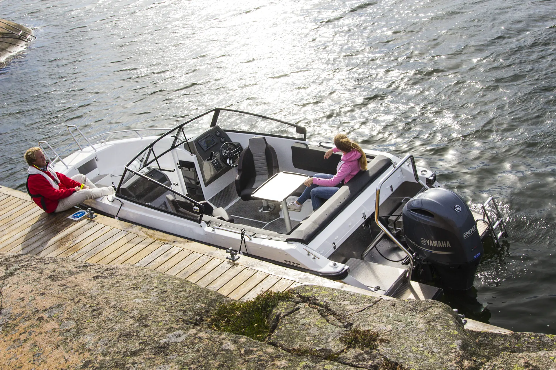 R7 har høyt fribord, og bow rider-løsningen med vindskjerm som kan lukkes, gir en ideell familiebåt. Foran konsollen er det mulig å ha en egen oppbevaringskasse som enkelt kan fjernes om du skal fiske eller liknende. Denne fungerer også utmerket som sitteplass for to personer – og her vil barna trives godt «for seg selv». For utflukter er det også store, vanntette stuverom på hver side i konsollen og god plass under benkene og salongen akterut. For dregg og tauverk er de to stuverommene i motorbrønnen gode å ha, og en praktisk detalj er også fenderholdere foran ved baugen.