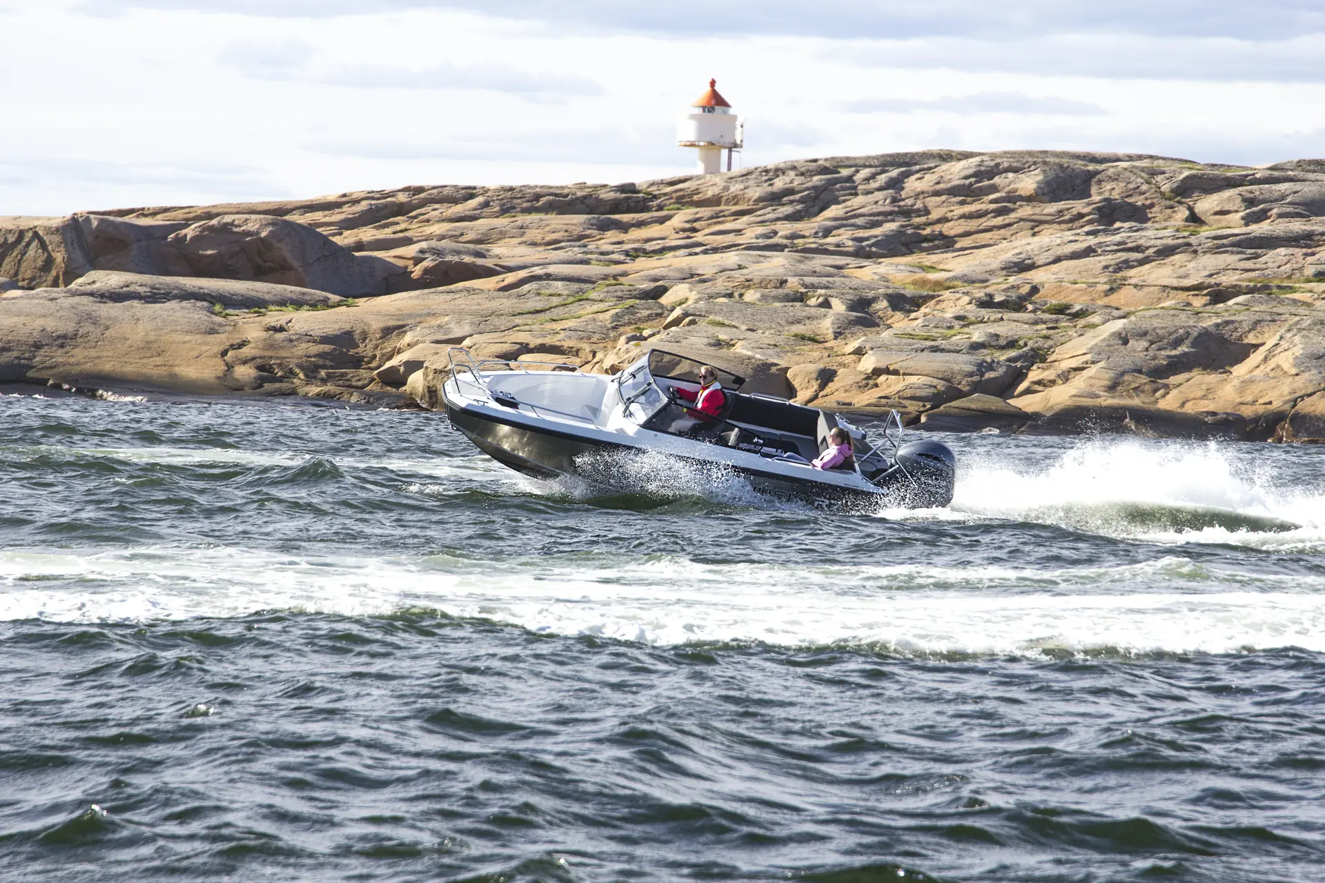 Båten leveres med motor fra 130 hk. til 200 hk., og med største motoralternativ finner vi en toppfart på tett oppunder 45 knop med en person og riktig trim. På silkeføre er det ingen tegn til dansing eller liknende, men både båt og forbruk oppleves selvfølgelig behagelig på marsjfart, rundt tretti knop. Ved rundt 4 200 omdreininger og 29 knop viser forbruket 27 liter i timen, men båten ligger også godt i sjøen ved 22 knop, der forbruket viser 18 liter i timen. Skal man kjøre lengre strekk, som vi til dels har gjort, blir det dermed litt knapt med en drivstofftank på 95 liter – men dette er riktignok tatt i betraktning at vi har største motor montert. Til sammenlikning snakker vi om 214 liter på storesøster.