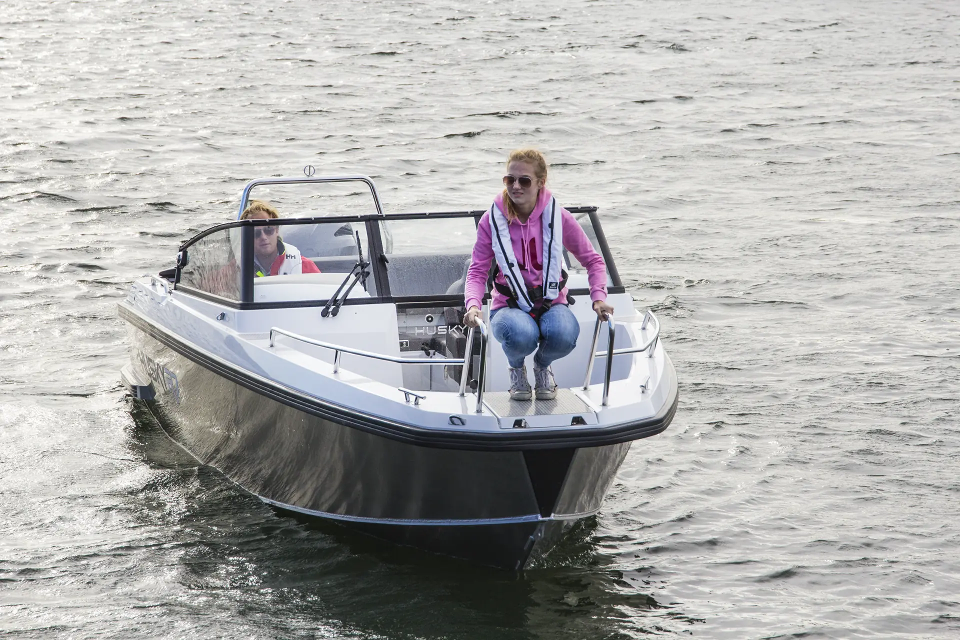 Selv om innredningen er i glassfiber, er det enkelte detaljer der fortsatt aluminiumen er gjeldende. Et eksempel er dørken, som både er slitesterk og enkel å holde ren i det daglige. Aluminiumen går også igjen på stuverommene i dørken, og foran i baugen. Resultatet blir en robust og røff båt, men med interiørdetaljer som også appellerer til familiebruk.