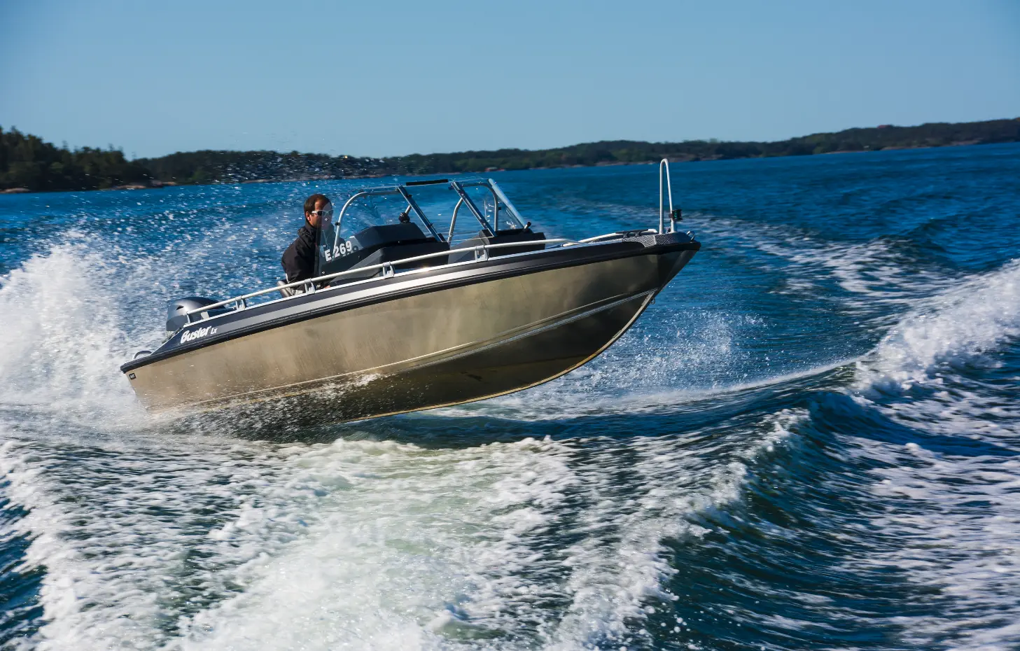 Lx har en stor førerposisjon med vindskjermer som dekker godt for vind. Dette er Busters minste båt med to separate stoler i fartsretning, og når vi kjører den får vi en følelse som normalt tilhører større modeller. Dette er mye båt for størrelsen, og takket være sofabenken akter er det plass til hele fem personer bak vindskjermen – på en 5,13 meter lang båt.