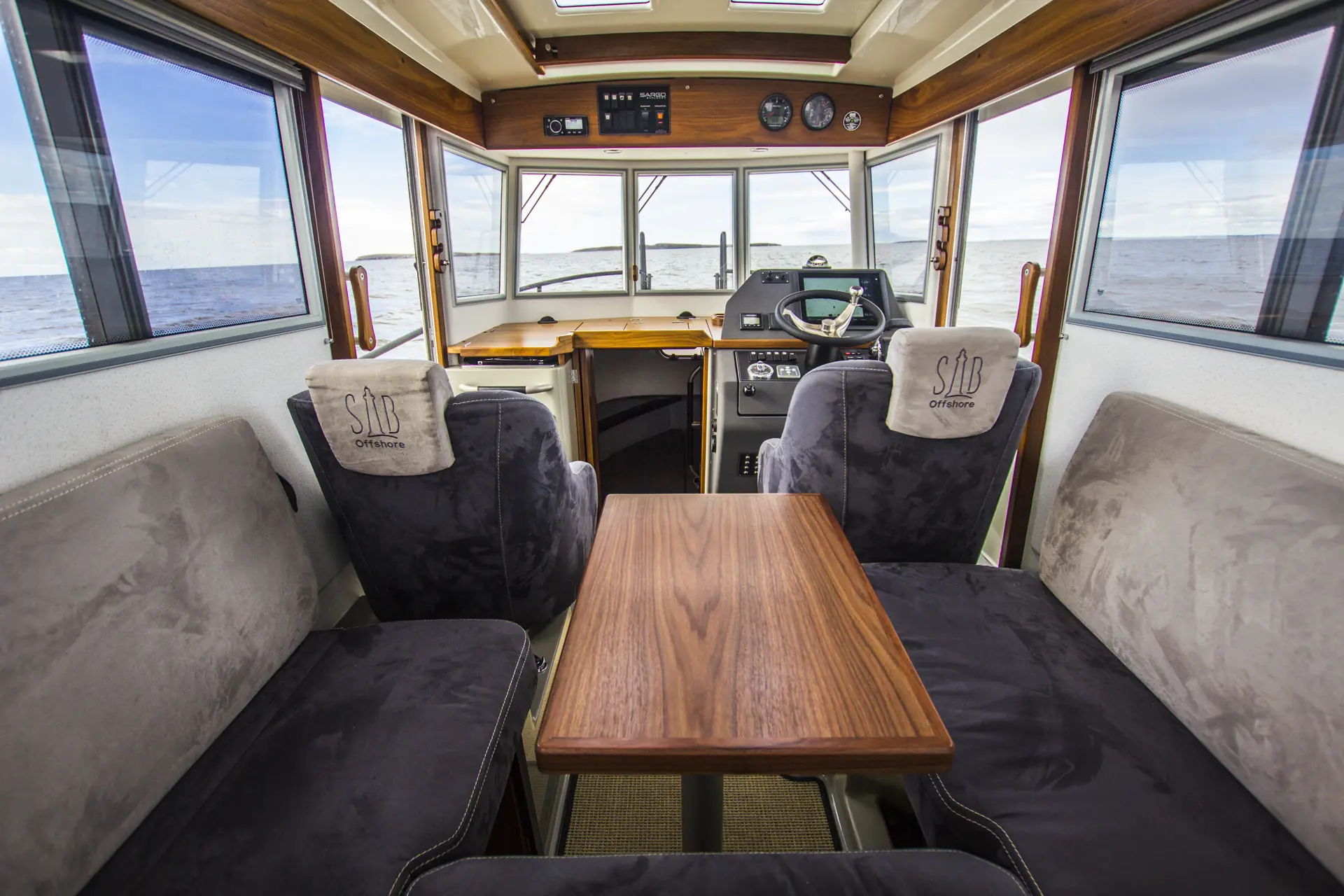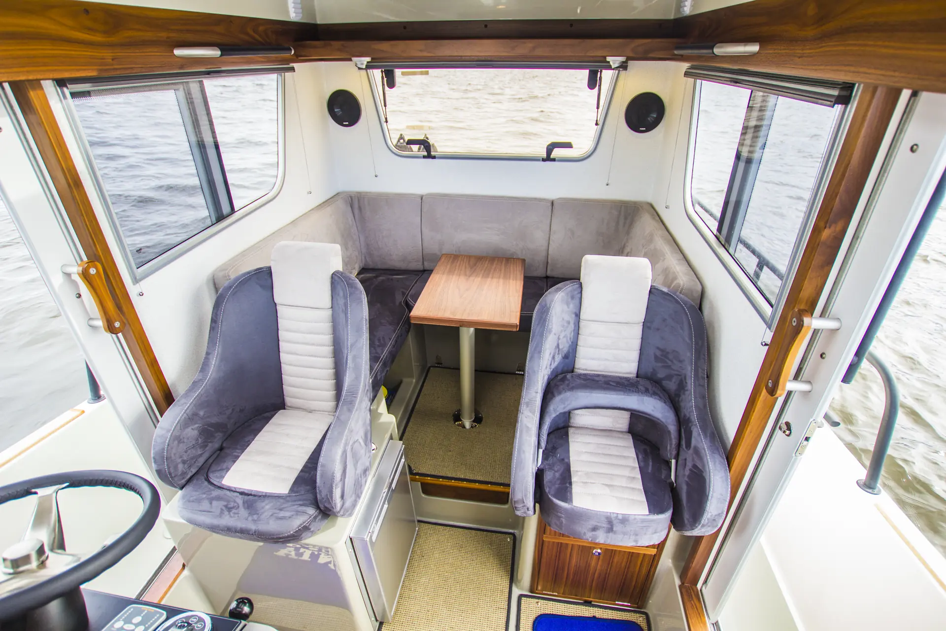 Selve styrhuset er ganske standard til å være i denne klassen, med skyvedører på hver side og to førerstoler i fartsretning som kan snus mot en U-sofa for tre personer. Her går det fint an å spise et måltid med tre – fire personer rundt det sammenleggbare bordet, som har fått en smart plassering under luken ned til midtlugaren. Denne løsningen fungerer utmerket, men vi må selvfølgelig legge til at bord og plass er med utgangspunkt i en 25-foter. Ergo er det ikke lagt opp for noen stor firemannsmiddag her.