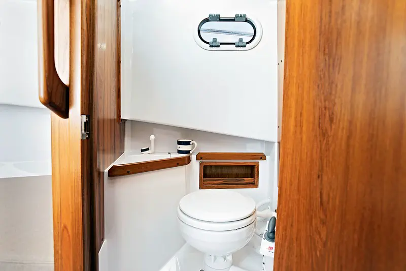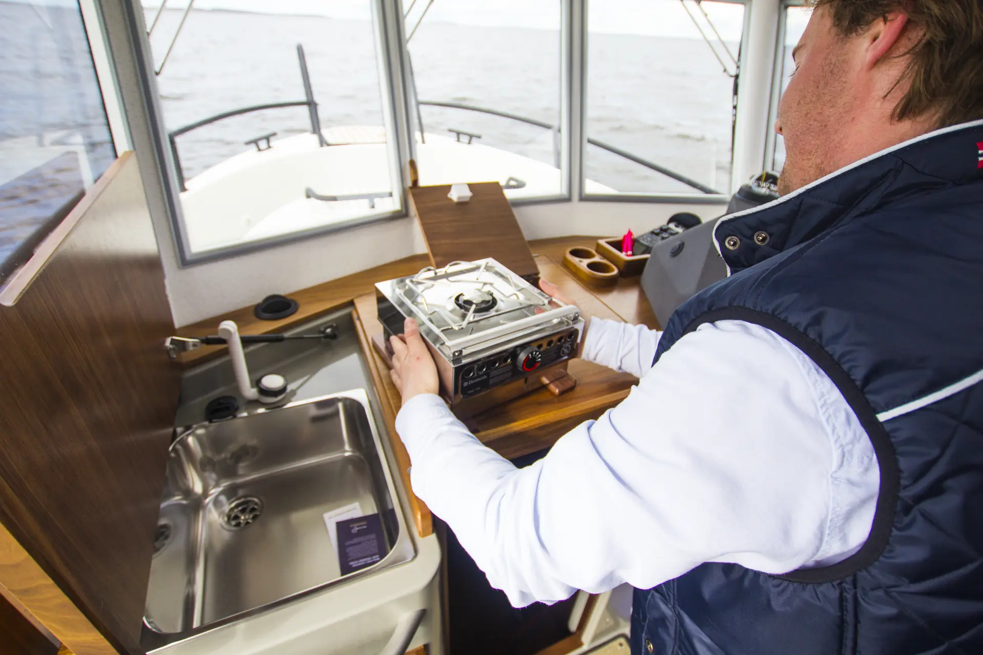 Som vi kjenner fra flere styrhusbåter er det også blitt plass til et lite pantry foran ved førerkonsollen. Med vask og ettbluss rødspritapparat får man både kokt kaffe og laget enkle måltider – og fordelen her er at det både er ståhøyde og god høyde på selve byssa også. En skuff for bestikk og et par andre rom for tørrvarer og liknende er det også her, i tillegg til et 50 liters kjøleskap under førerstolen.