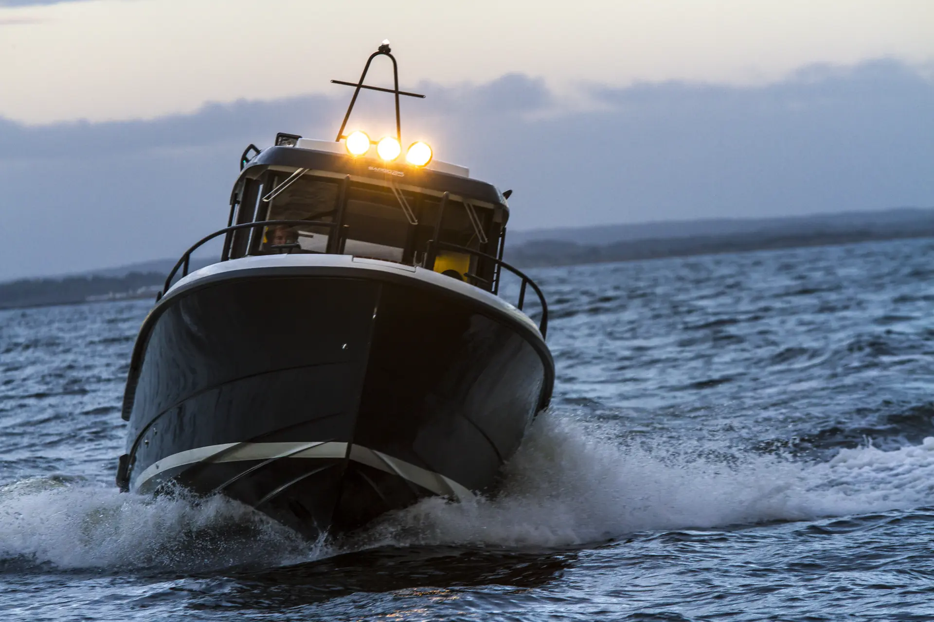 Med Volvo Penta D4-260 måler vi en toppfart på opp i mot 36 knop og en behagelig marsjfart på like under tretti knop. Både forbruk og støynivå skiller seg ikke nevneverdig ut fra alternativene, med en liter per nautisk mil ved ca. 26 knop. Båten legger seg godt over i sving, men føles samtidig forutsigbar og trygg å kjøre, også i høyere hastigheter. Siden dette er en påkostet explorer-utgave savner vi demping i de to setene, men utover dette er komforten upåklagelig – og det er også optimalt å stå og kjøre når bølgene blir store.
