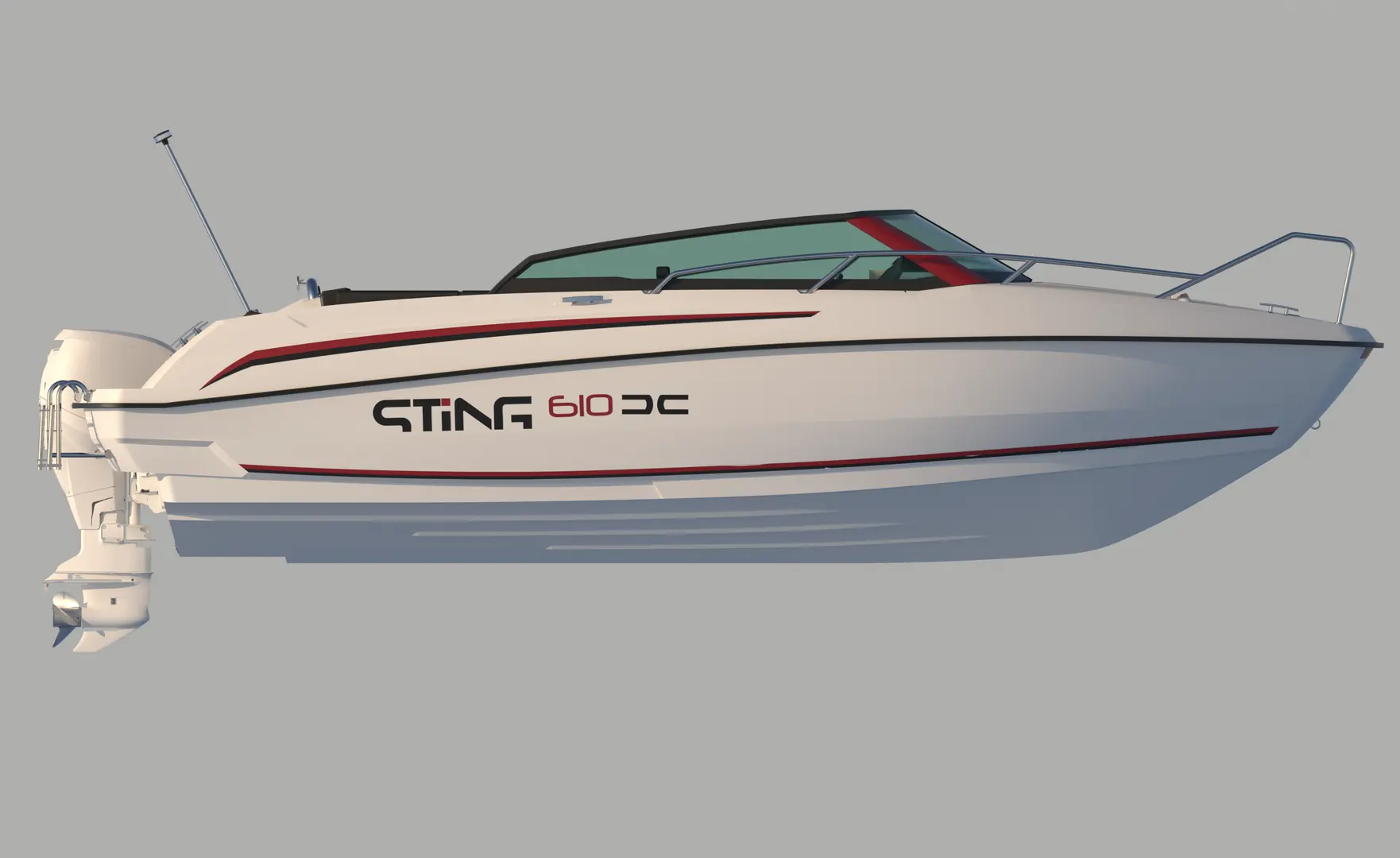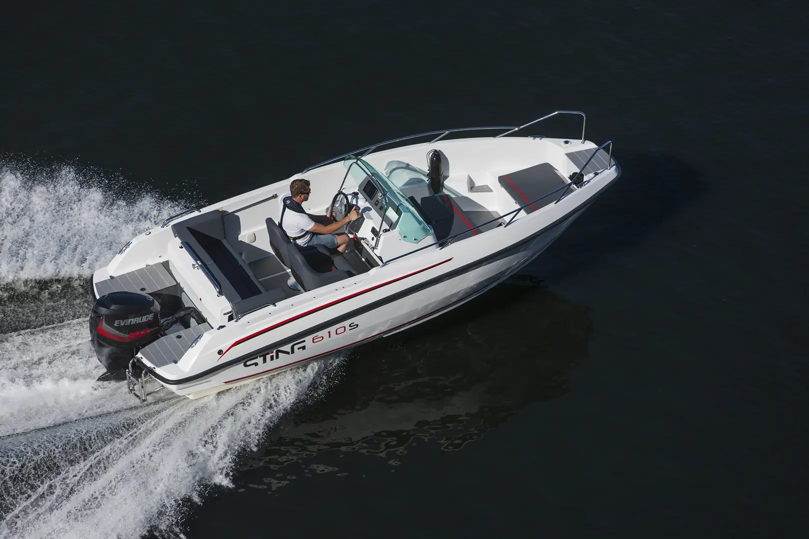 Det er også montert pulpitt i den høye baugen, noe som gjør det trygt og enkelt å komme seg både ut og inn. Konsollmodellen har blitt lånt fra Sting 530, men denne er større. Vindskjermen er både bredere og høyere, noe som sikrer deg mot vind og sprut. Båtene leveres ferdig montert og utstyrspakke inkludert i kjent Sting-stil. Maks motorstørrelse er 150 hestekrefter. 610S med 115 hk. koster kr. 299 900,-, mens daycruiseren koster kr. 359 800 med samme motor, mens bowrideren ikke er priset enda.