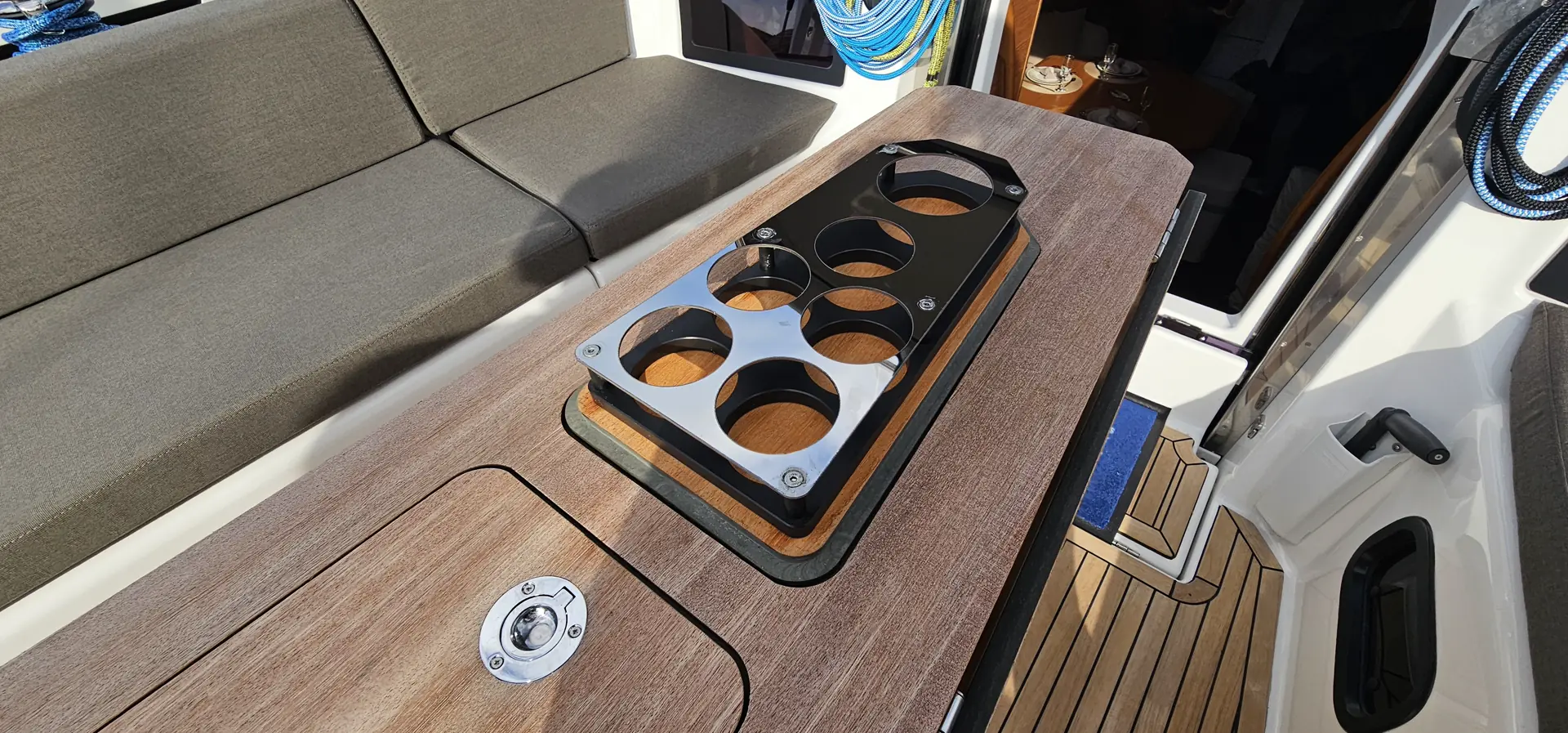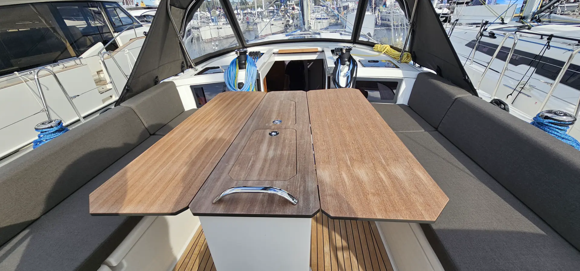 Spesielt er det verdt å merke seg den ryddige plassering av vinsjer og tauverk til seilene. Med denne plassering går du fritt ut på dollbord og, du får heller ingen tauverk ned i sittegruppen.