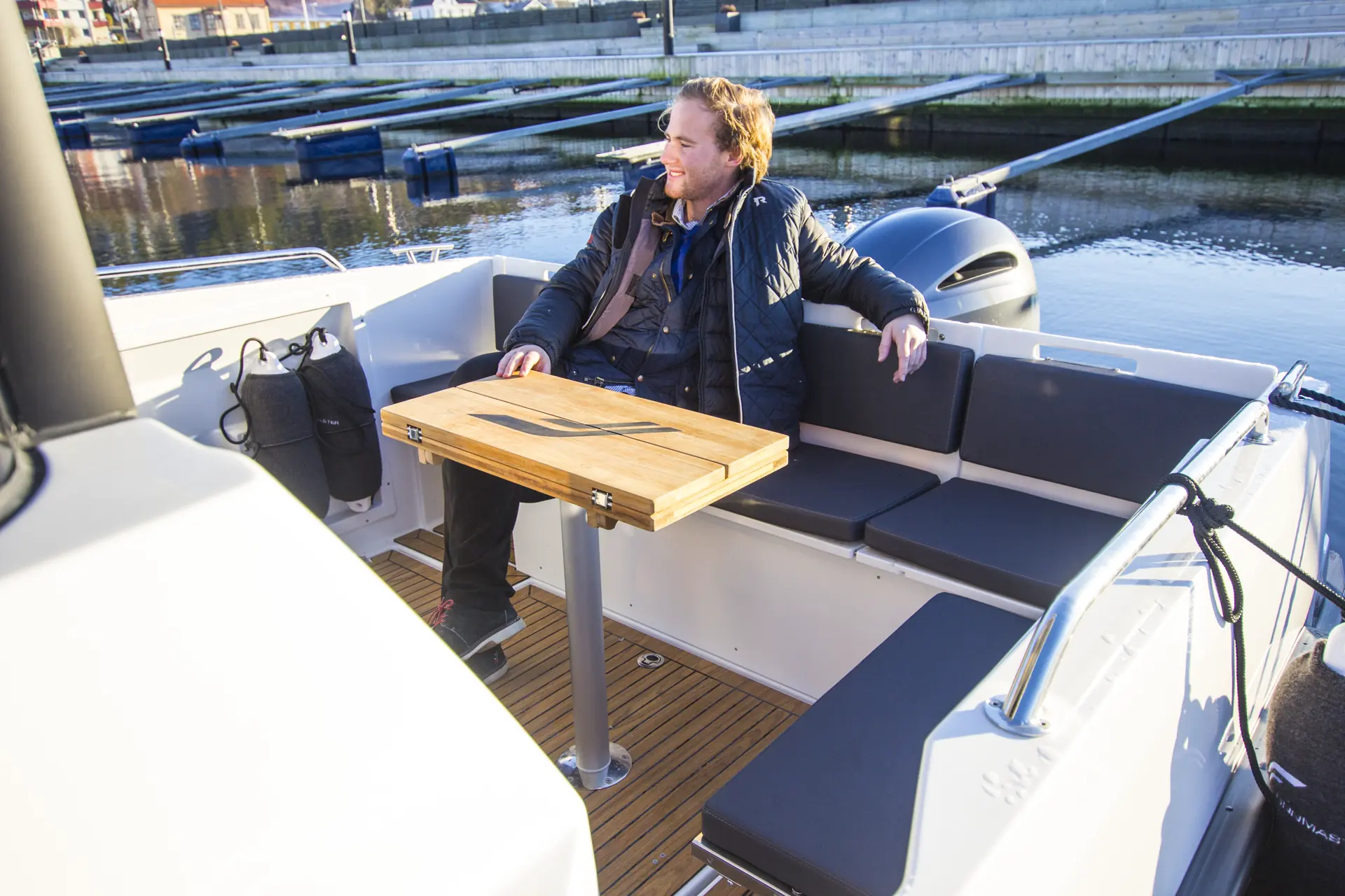 Akterdekket er praktisk innredet med en benk for fire personer helt akterut, samt et sete som kan felles opp slik at man får en L-sofa. Med tilhørende bord kan en familie på fire personer fint spise middag her, og her får du også en egen kalesjeløsning. Det er enkel adkomst til badeplattformene rundt motoren med egen port på styrbord, og vi liker godt fenderholderne i skrogsiden, samt rommene i akterbenken for lett tilgang til fortøyningsmateriell. Det er også plass til større kulefendere i rommene i dørken.