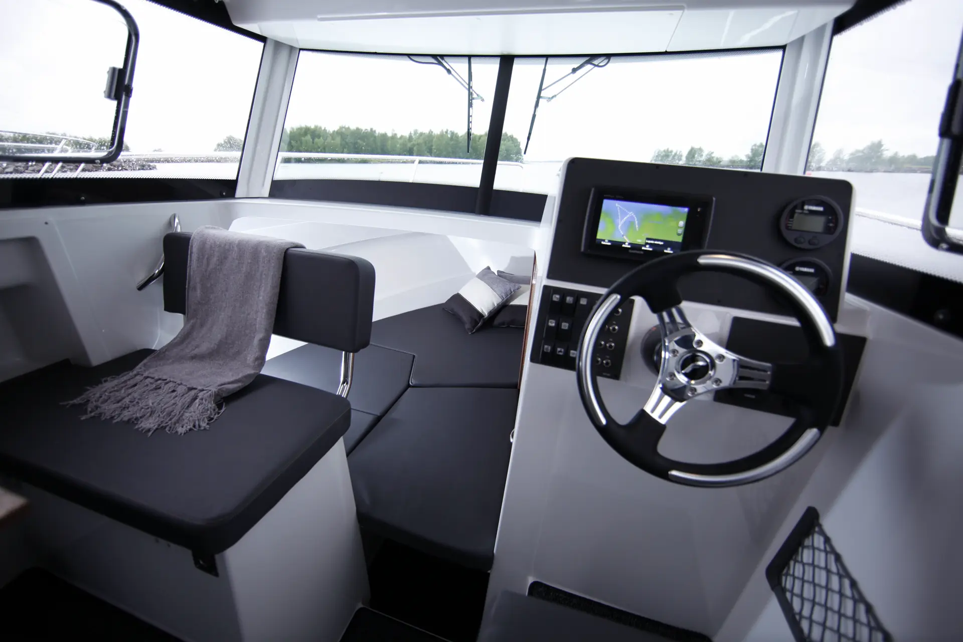 Et tegn på at Finnmaster har tenkt litt mer på familiebruk er den store, åpne skyvedøren, med vinduer over hele bredden til styrhuset. Endelig en dør som gir mye lys og god sikt for føreren. I styrhuset er selve planløsningen ganske tradisjonell – med to sofabenker mot et bord på babord, samt bysse og førerposisjon på motsatt side. Et stort pluss er at ryggen på sofaen over førerplassen kan vendes, slik at co-føreren også kan følge med i fartsretning. Man sitter også høyt og har god sikt utover fra salongen, og bordet gjør at man kan spise middag også her for to voksne og eventuelt to mindre barn.