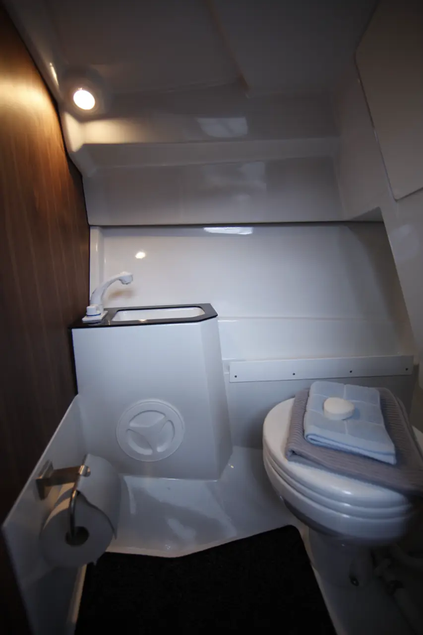 Bysseseksjonen har helt greit med benkeplass dersom førersetet vippes fremover, og det er spesielt pluss at det er gjort plass til mindre ting, kopper og tilbehør i eget skap i skrogsiden. Alt i alt inneholder byssa et kokebluss, en vask og kjøleskap, samt greit med skap. Det vi savner er skuffene for bestikk og så videre, og med dette på plass er faktisk byssa komplett for en helge- eller ukestur.