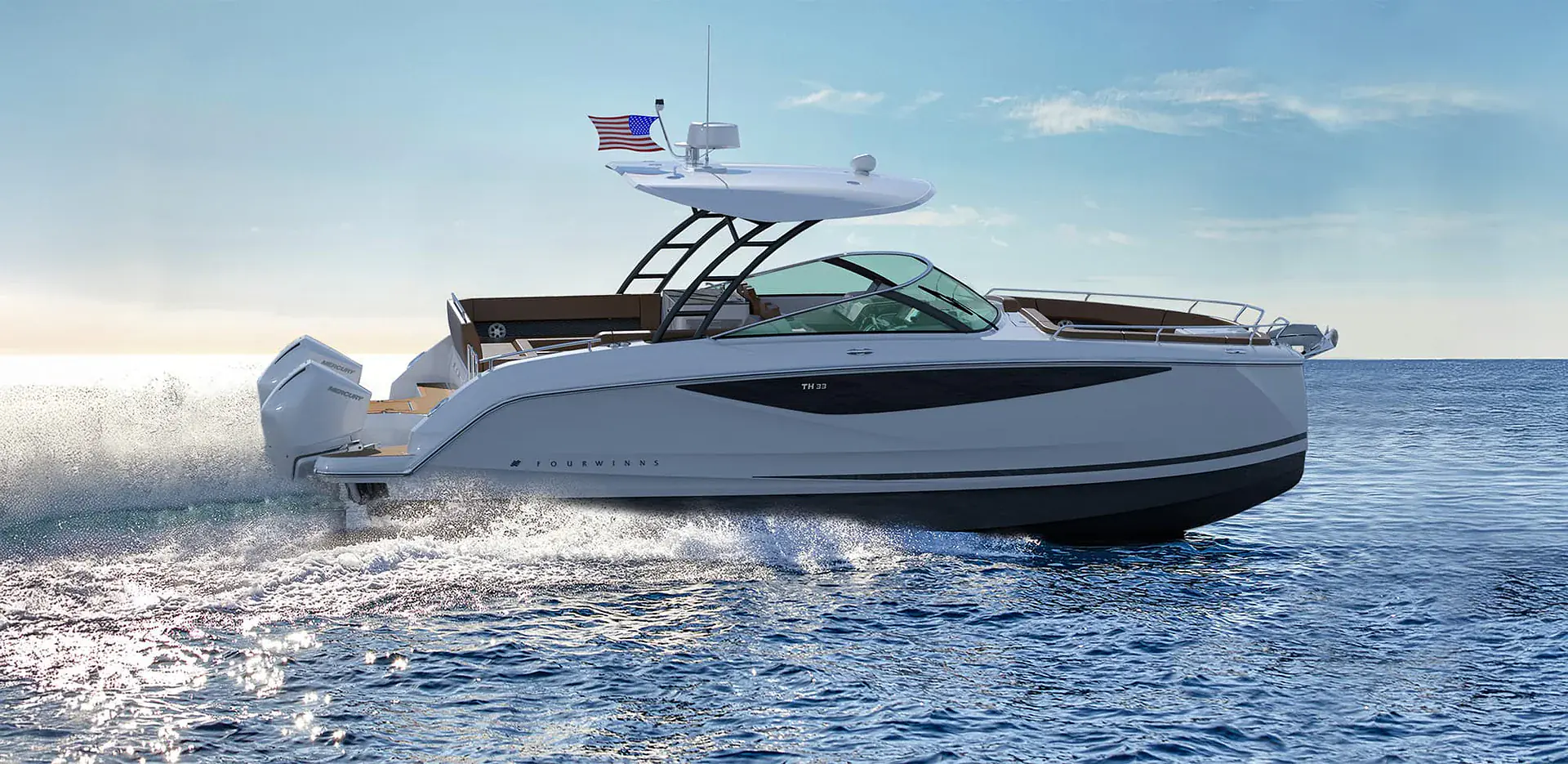 TH33 er CE-sertifisert for åtte personer i kategori B og 12 i kategori C, og doble utenbordsmotorer inntil 600 hk. totalt. Ved førerposisjonen finner man to ekstra brede seter, doble 12-tommers Garmin-skjermer samt en 7-tommers passasjerskjerm. Hele førermiljøet er beskyttet av en bred, buet frontrute i klassisk Four Winns-stil.