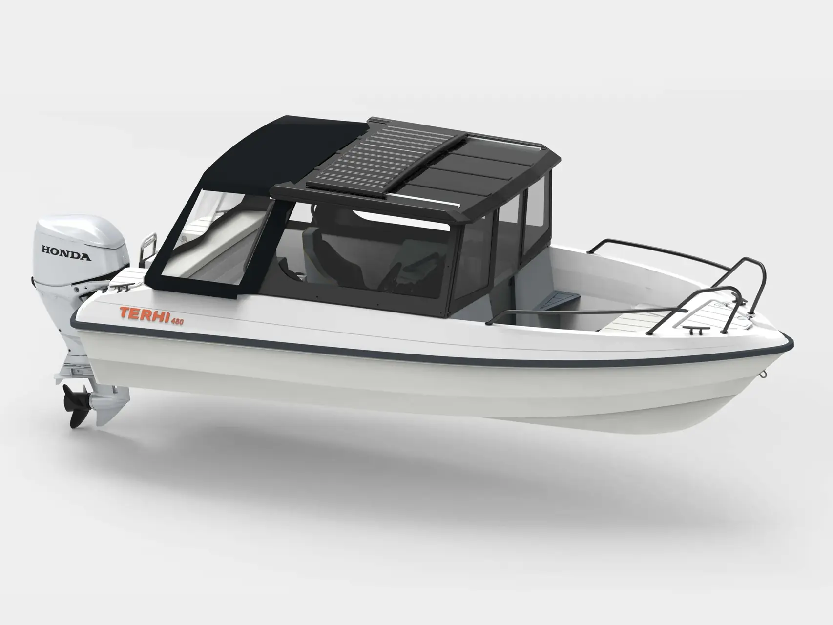 Finske Terhi sin 480 BR kommer i hard-top-versjon med lansering på Helsinki Vene24Båt i februar. Modellen, som får navnet Cabin, skal beskytte fører og passasjerene i større grad. Hytta får soltak for varme dager – som også gir mulighet til å kjøre båten mens du står. En dør leder ut til fordekket, og kabinen har ingen lukket bakvegg, men du kan kjøpe til kalesje.