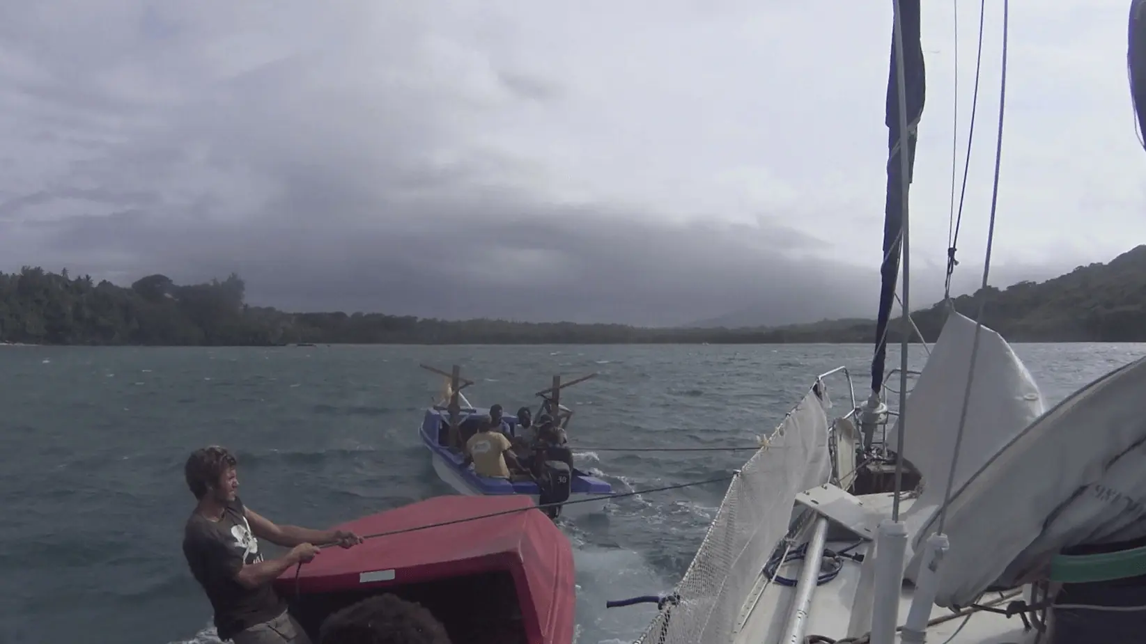 Da Paul kom fram med jolla hadde hun allerede drevet ut av bukta og ble slengt rundt av to meter høye dønninger. En annen seiler hadde kommet oss til unnsetning og joinet Linn Charlotte i forsøket på å få opp ankeret som hadde festet seg bak ett rev. Da det omsider var oppe kom to lokale fiskebåter som hadde fått nyss i saken etter et desperat telefonanrop fra Linn Charlotte til en bekjent av høvdingen. Motoren vår var ødelagt og siden vinden blåste rett ut av bukta måtte vi sette vår lit til fiskerne. Etter to timer felles innsats, svette og blod fikk de slepet Amanda på plass gjennom sundet. Vi satt igjen med en stor lettelse og et stygt kutt i foten til Paul som skulle sette ham ut av spill i ukene framover. Snakk om hell i uhell! Hadde vinden kommet fra en hvilken som helst annen retning hadde vi enten strandet på revet eller kollidert med klippene vis-à-vis og båten hadde vært fillebiter...