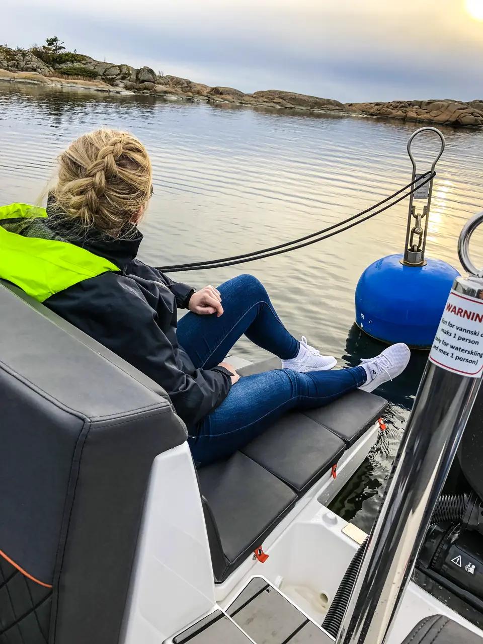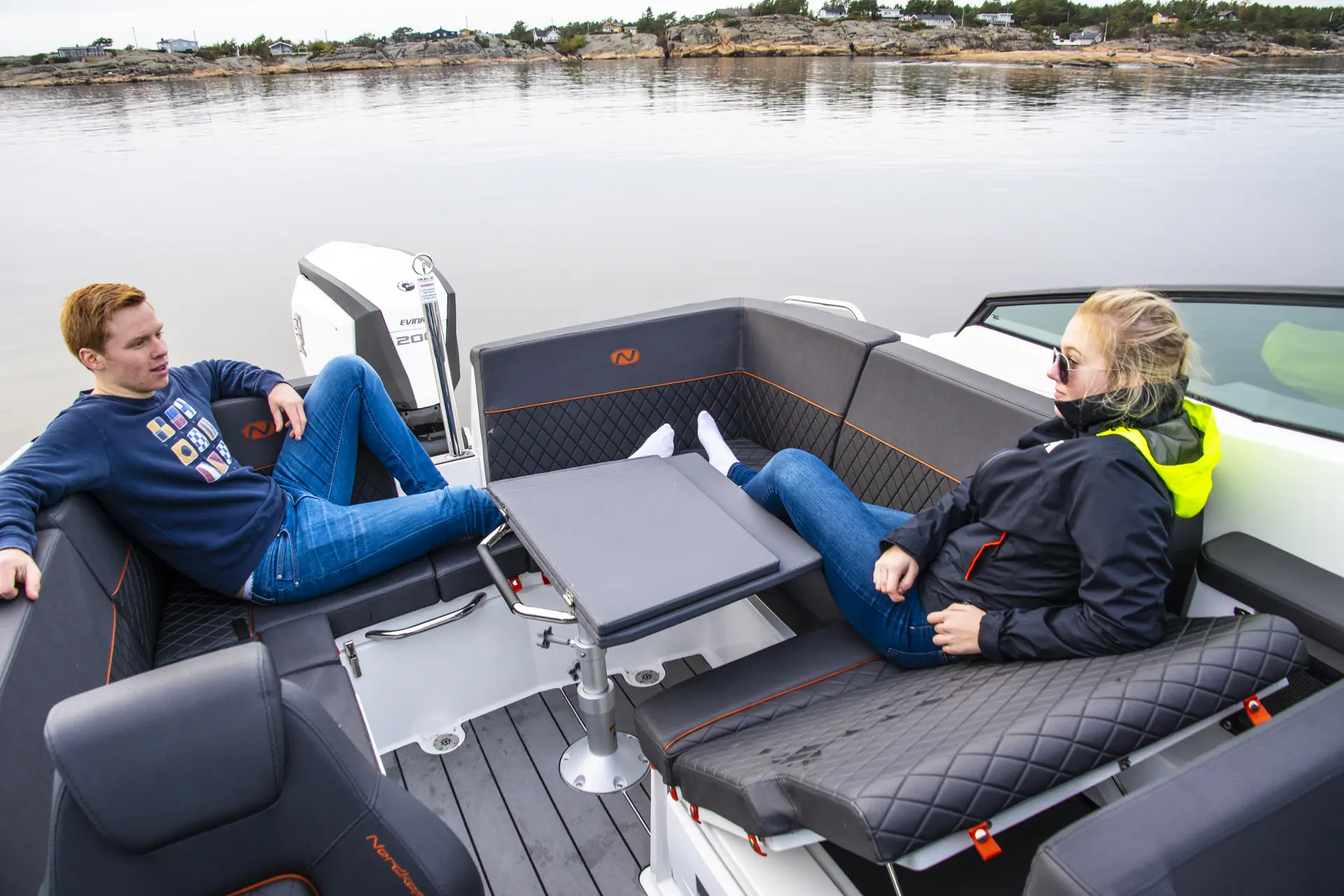 Akterpartiet på denne båten med utenbordsmotor er ikke bare egnet for bading og sprell – med to puter har du en flott avslappingsplass med ryggstøtte. Om ikke Nordkapp er alene om denne løsningen, er det en smart detalj for ekstra komfort. Også på dekk får du en ekstra solpute – og her kan ryggen vippes opp for riktig vinkel – samtidig som at denne fungerer som luke ned til kabinen.