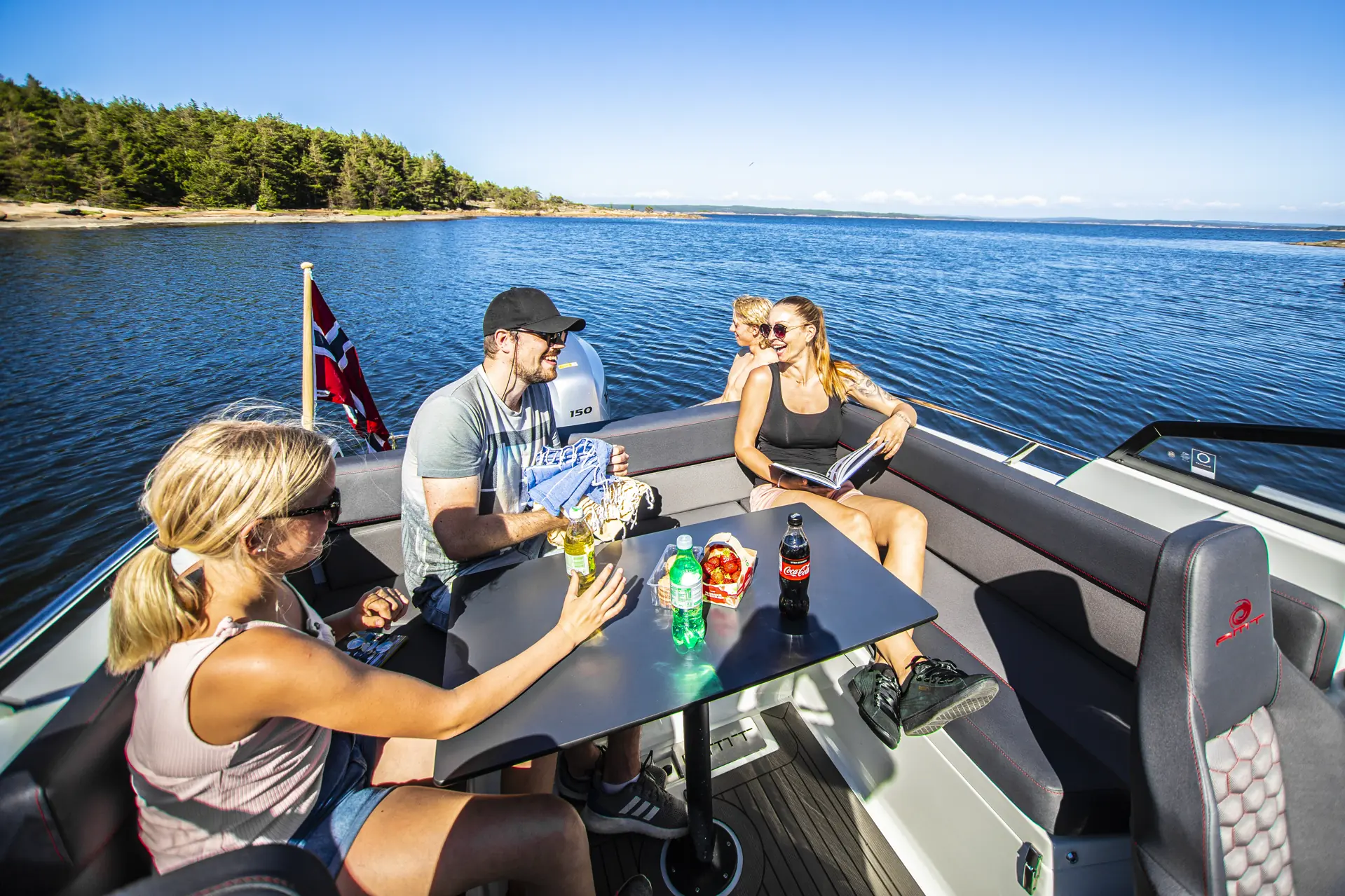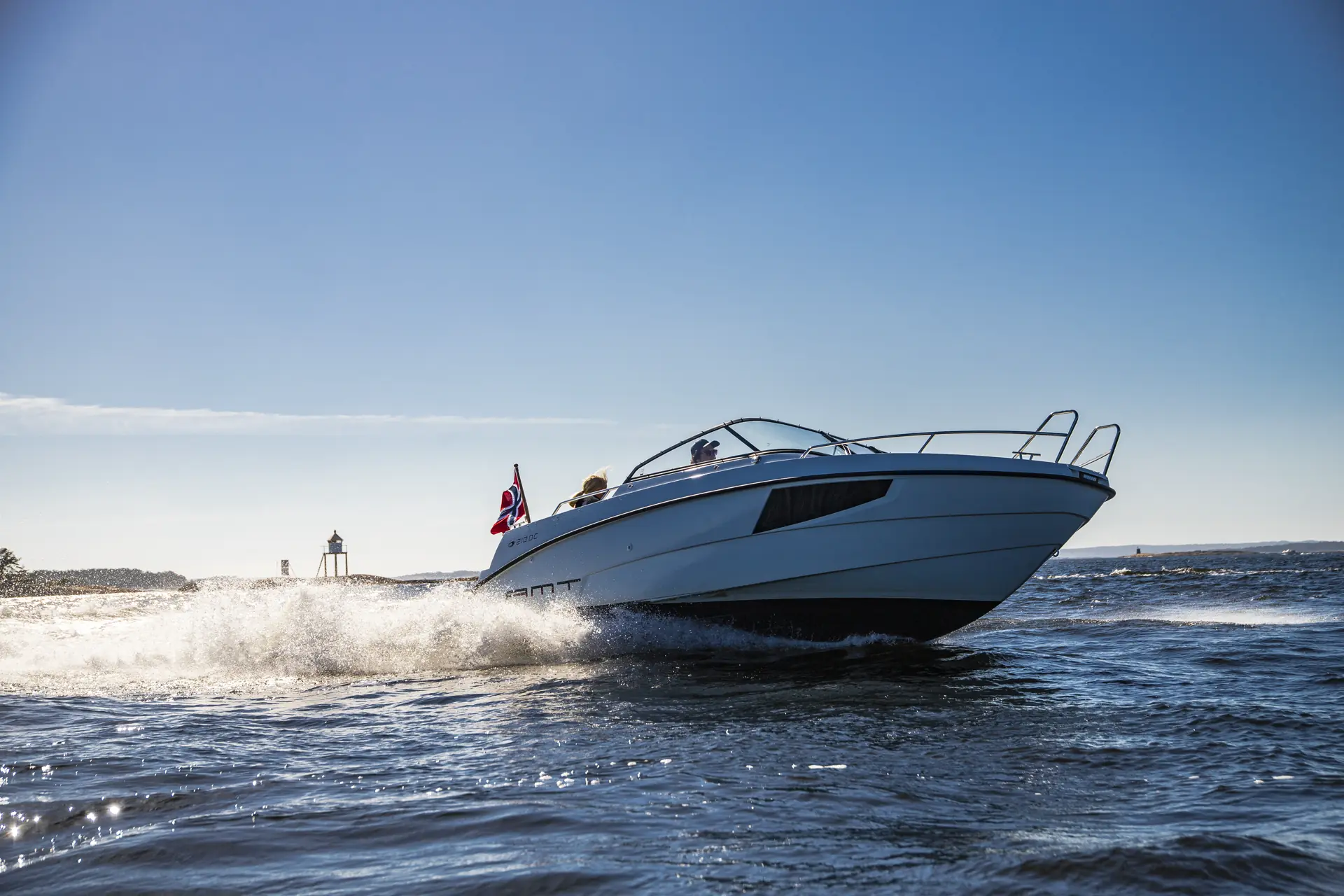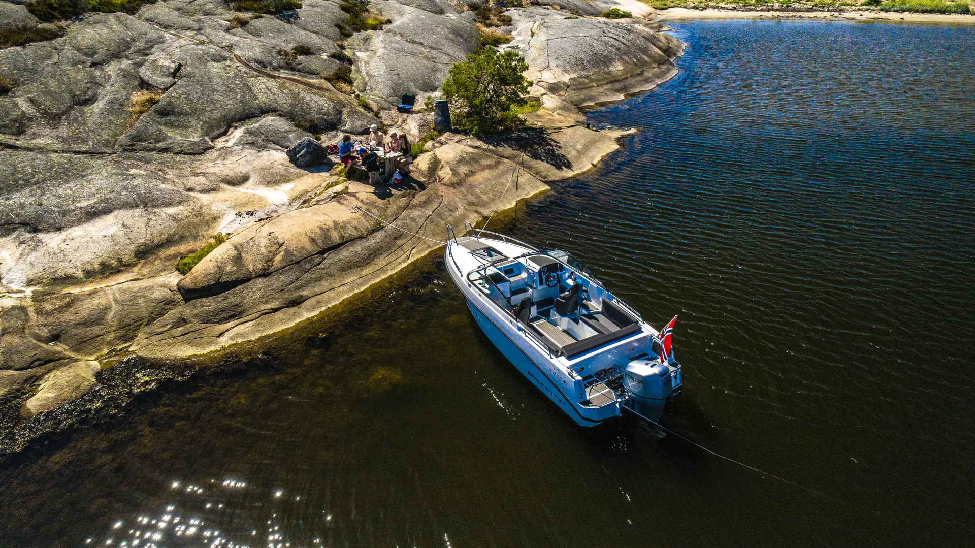 AMT har rigget båten med mye nyttig utstyr som standard. På listen finner vi blant annet en 9-tommers kartplotter fra Raymarine med integrerte motordata, låsbare stuverom, bord og solseng, USB eluttak for lading, tau, fendere, anker og reservekanne. Sistnevnte har fått sin plass sammen med ankeret på babord side ved motorbrønnen – med lufting. Med på utstyrslisten finnes også bauglys, som fungerer godt for å gjenkjenne staker og sjømerker på nattseilas, når du kommer inn til havna – eller når du ligger i naturhavn og må opp på natta på et ærend eller to.