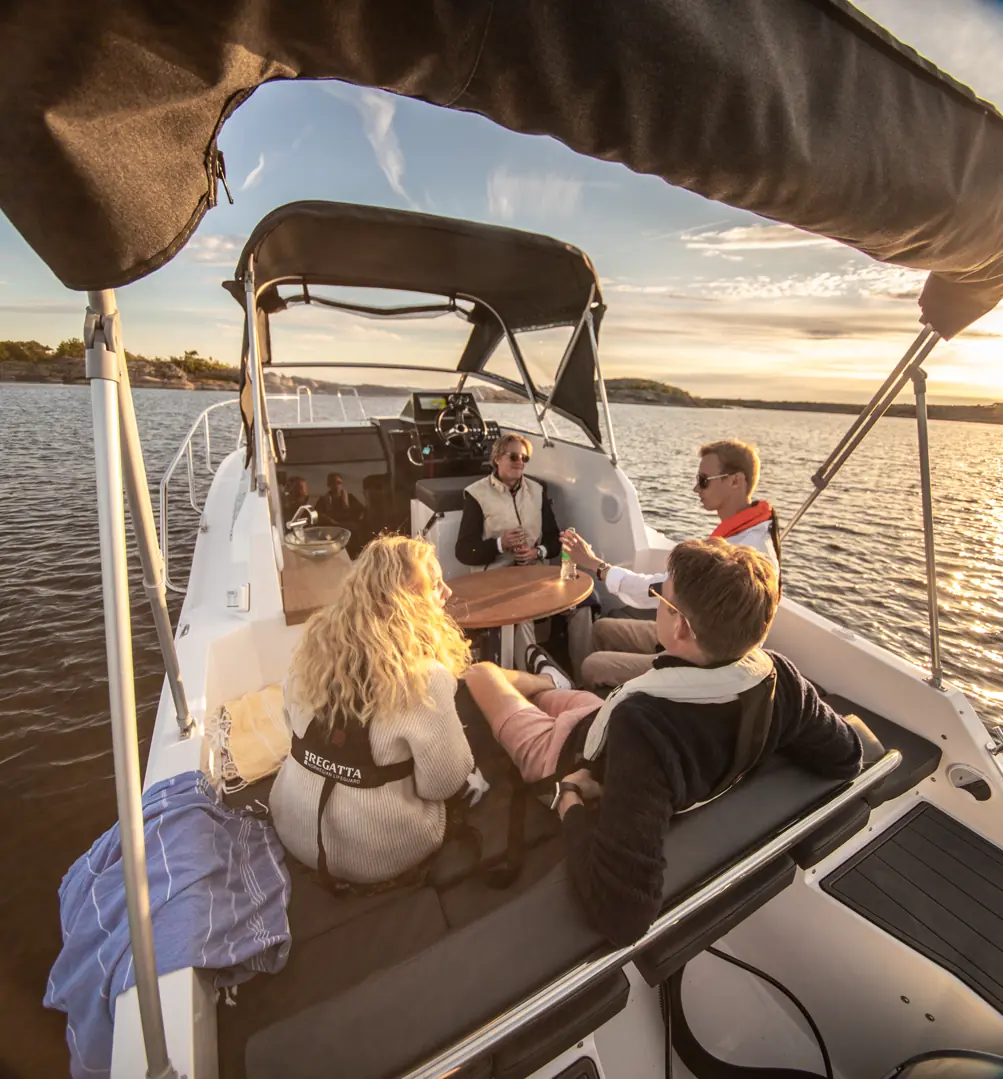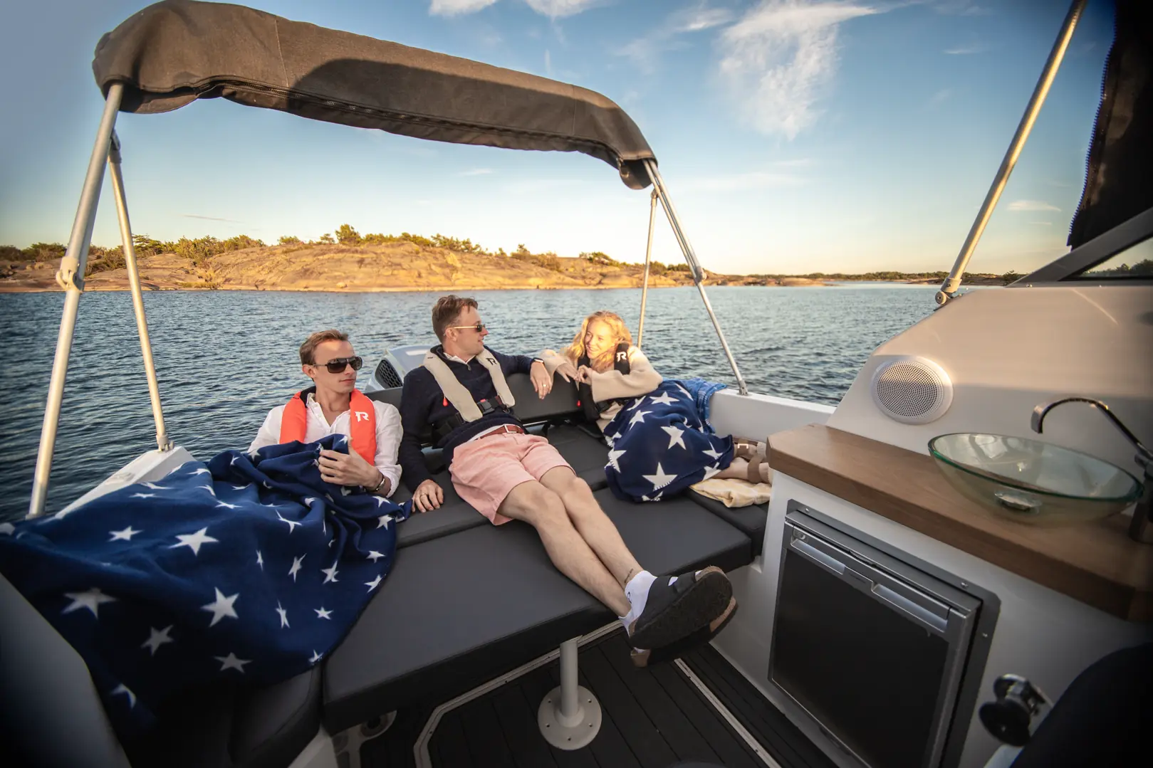 Uteplassen har to høydenivåer – det koster nemlig å ha en stikklugar. Helt aker har båten en slags U-sofa med plass til fem personer, og feller du ned ryggen til førerplassen får du ytterligere en-to plasser. En velfungerende løsning, og med et tilhørende bord kan det dekkes til fire-fem personer.