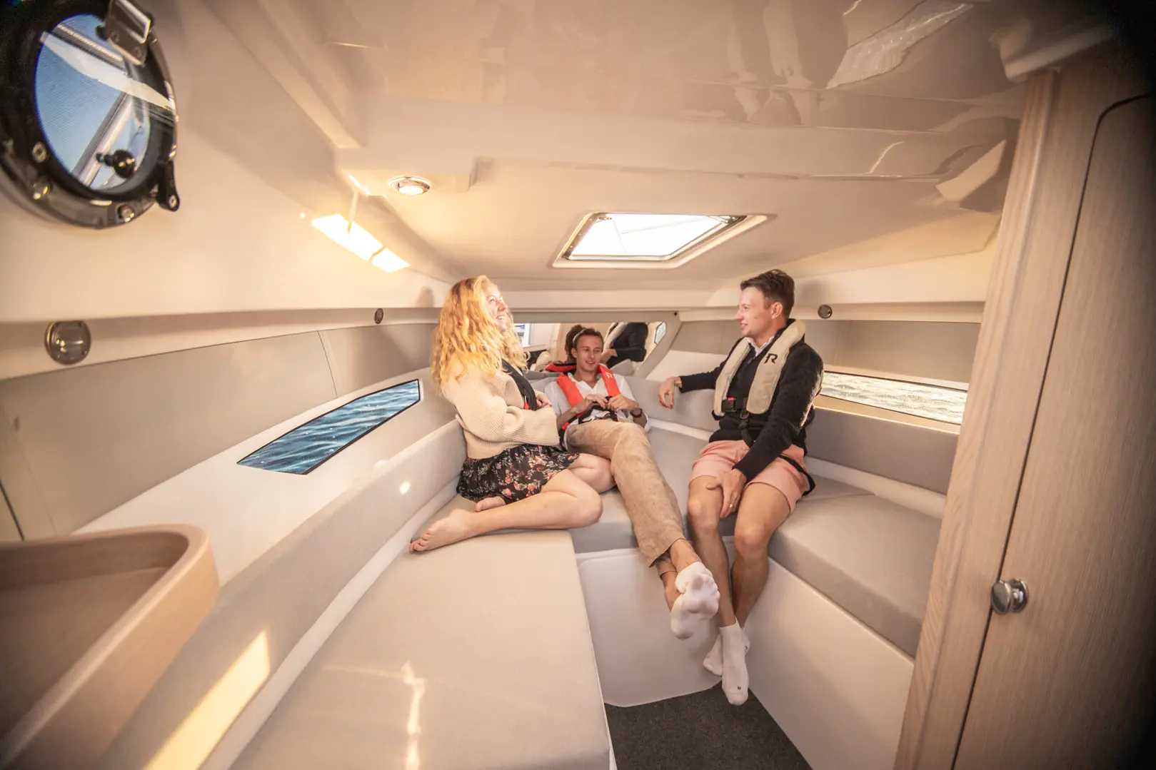 Forut er en sofagruppe for tre-fire personer der voksne kan sitte nokså komfortabelt, og med en ileggsplate får du en god og bred dobbeltseng. Avlange vinduer i skrogsiden, lufting i koøye og takluke, bidrar til ypperlige overnattingsmuligheter. Det samme gjør toalettrommet. Her er elektrisk spyletoalett, vask med blandebatteri som også kan brukes som dusj – og heller ikke her er det trangt. Pluss for koøye som kan åpnes med integrert myggnetting, tilsvarende som er i kabinen.