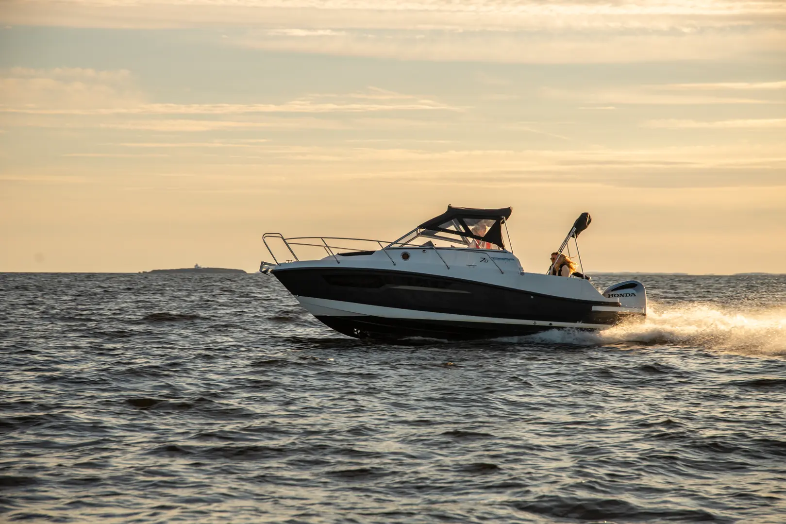 Drago 750 veier 1 895 kilo uten motor, og med dimensjonene til båten er det også et viktig poeng at båten skal være enkel å frakte på tilhenger. Anbefalt motorisering er fra 150 til 300 hk., og på vår testbåt står 250 hk. fra Honda. Det gir det vi opplever som et lettdrevet skrog en toppfart på 40 knop, som etter vår umiddelbare mening betyr at denne båten trolig vil gå veldig bra med en mindre motor. I 29 knop måler vi et forbruk på 1,38 liter per nautisk mil og 1,19 l/nm i 21 knop. Også dette må sies å være pene tall for en såpass voluminøs familiebåt.