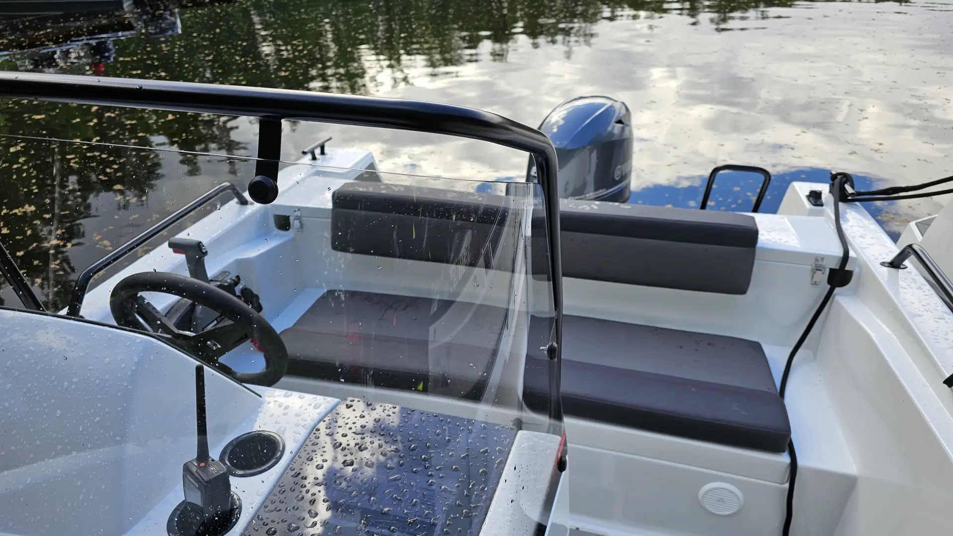 Båten har lav planingsterskel (11 knop) og 2 personer sitter godt skjermet for regn og vind i denne sidekonsollbåten.