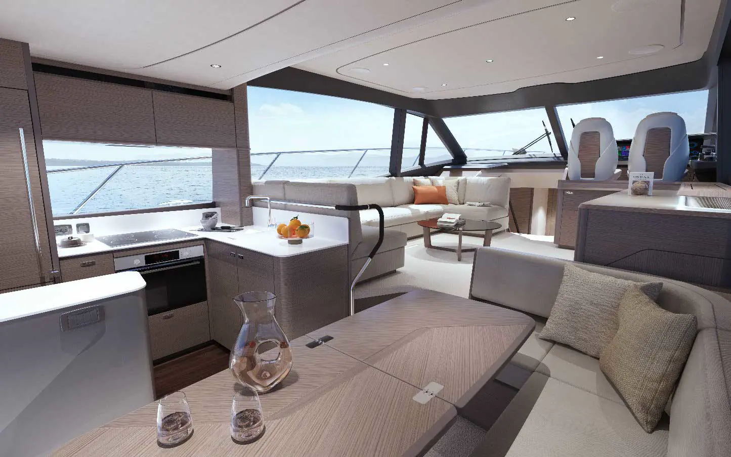En moderne U-formet sofa med et justerbart kaffebord/spisebord og en sofa på motsatt side gir et ideelt sted for kvalitetstid med familie og venner. Den velutstyrte byssa er plassert akter i salongen, og binder sammen akterdekket og de innvendige spiseområdene, noe som skaper en svært sosial og funksjonell planløsning.