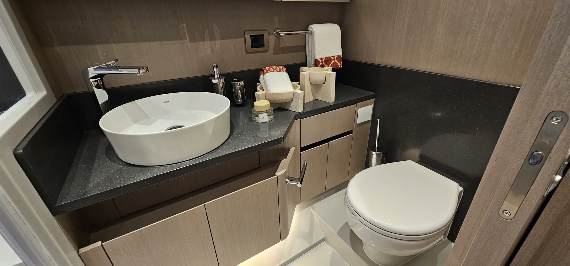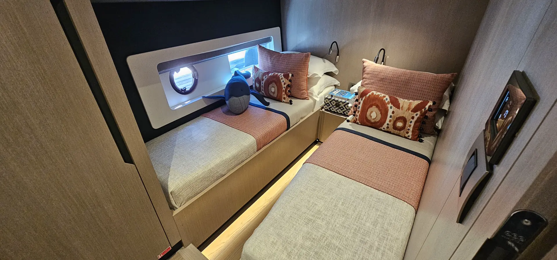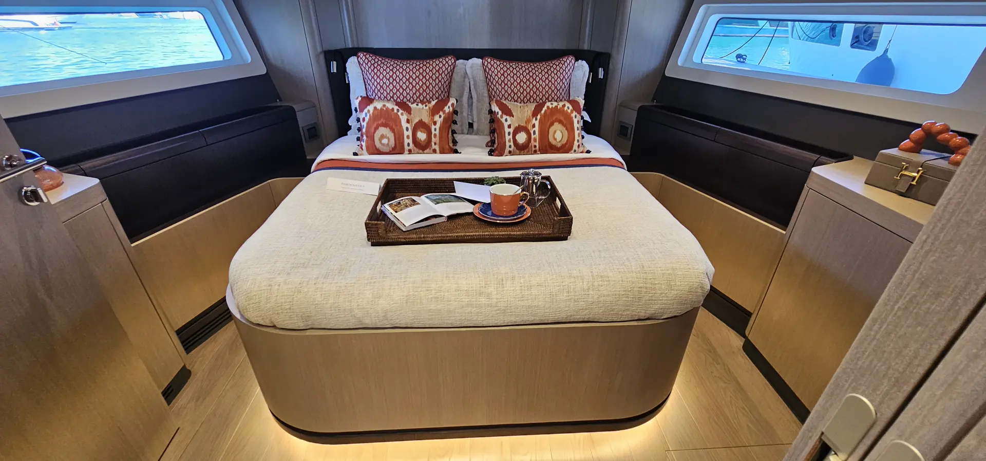 Master kabin strekker seg over hele båtens bredde midtskips på det nedre dekket. I tillegg til en king size-dobbeltseng, har denne avslappingssonen en dyp sofa på styrbord side og et sminkebord eller skrivebord på babord side. Det tilhørende badet har en separat dusj og godt med lagringsplass for toalettsaker.