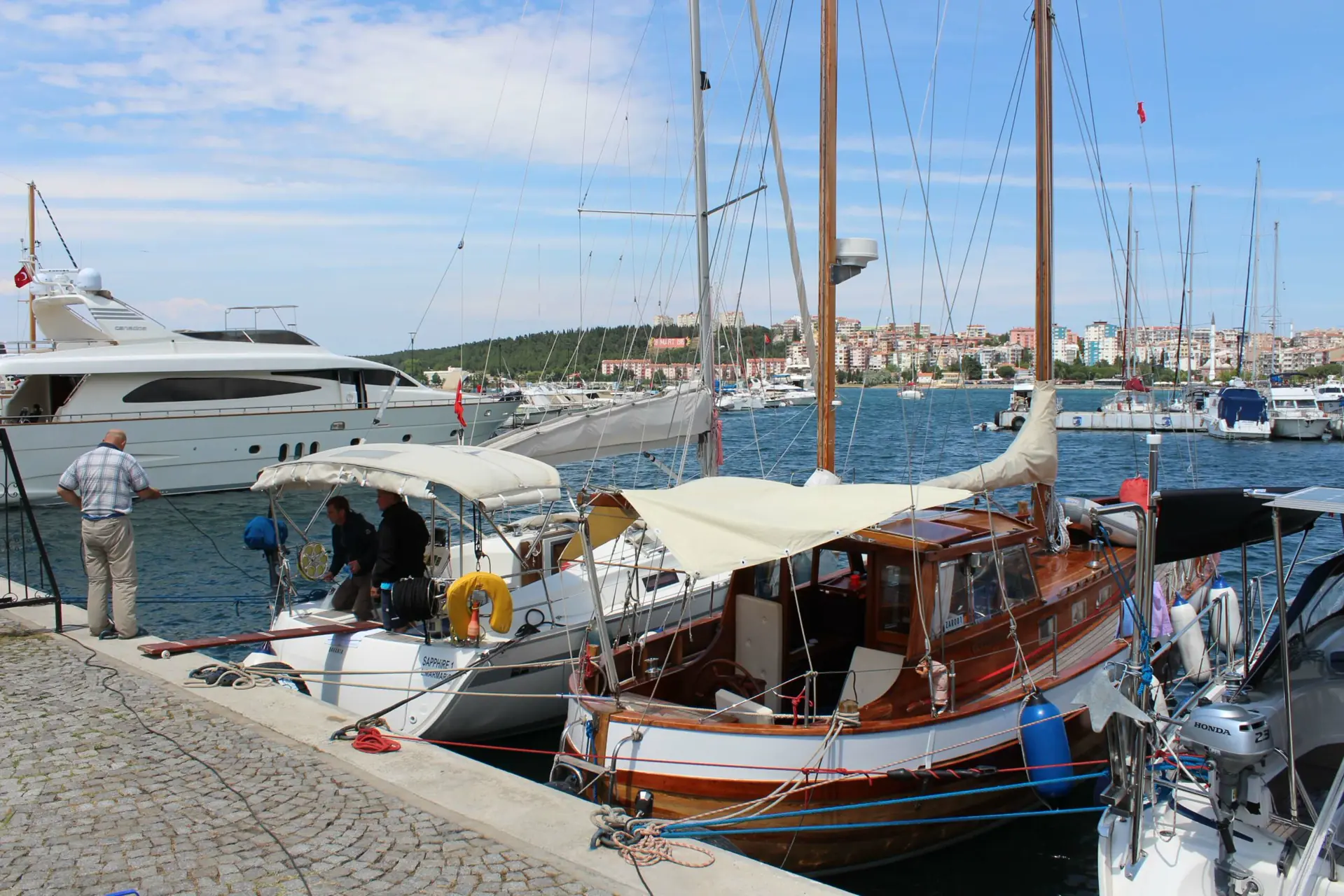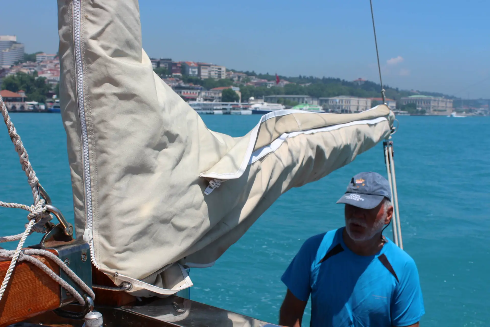 Dagen etter var det et spent mannskap seilte ut i Bosporos med kurs for Istanbul. Bosporos er som en travel handlegate før jul, båter på kryss og tvers, mot oss og etter oss. Vi måtte hele tiden passe oss for ferger som krysset leden. Det var en stor opplevelse. Historiske bygninger lå på rekke og rad.